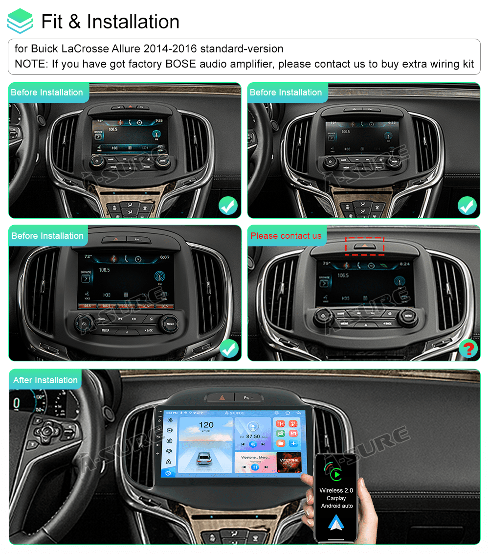 Here is a 150-word product description for the OmniPure car stereo: **Upgrade Your Ride with OmniPure** Take your driving experience to the next level with the OmniPure 10.1" Android 13 Car Stereo Radio Designed specifically for Buick LaCrosse Allure models from 2014-2016, this advanced system offers unparalleled entertainment and navigation capabilities Key Features: • **Wireless CarPlay**: Seamlessly connect your iPhone or iPad to enjoy a safer and more convenient driving experience **GPS Navigation**: Get real-time directions with built-in GPS and access to millions of points of interest