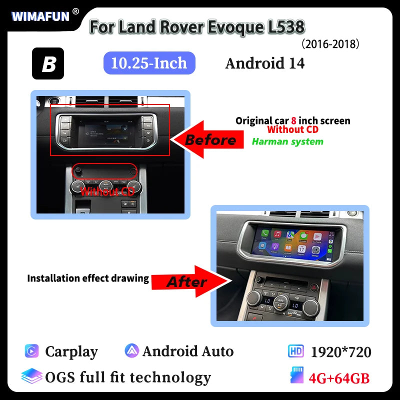 10.25" For Range Rover Evoque L538 2012-2018 Car Radio Navigation Multimedia Screen Bluetooth Player Android 14 Carplay Auto