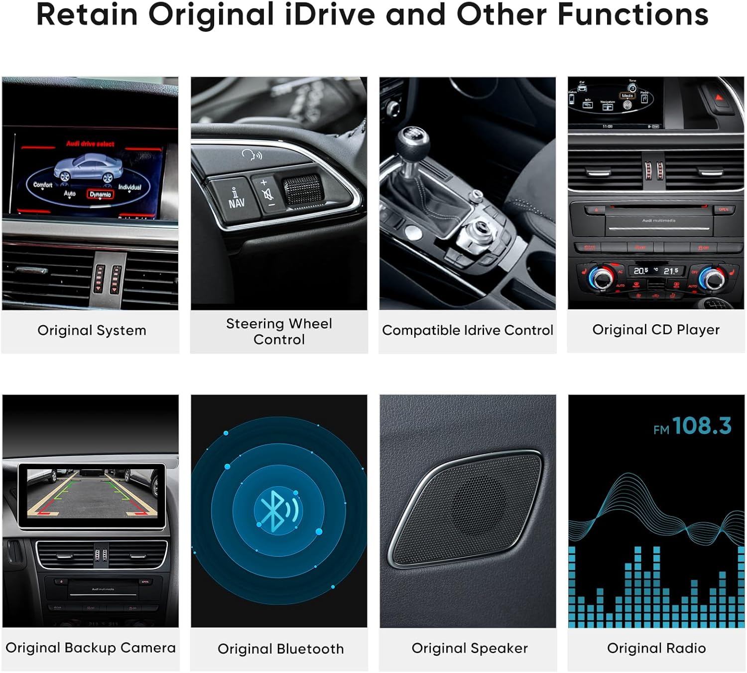 - Maintain full compatibility with the original car radio system, including iDrive knob control, Bluetooth, radio, Original rear camera, radar system, and steering wheel control