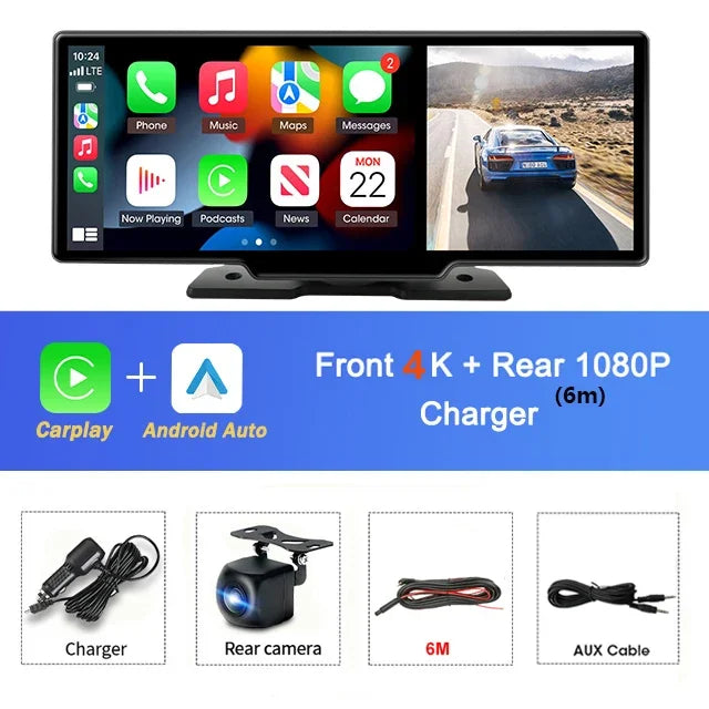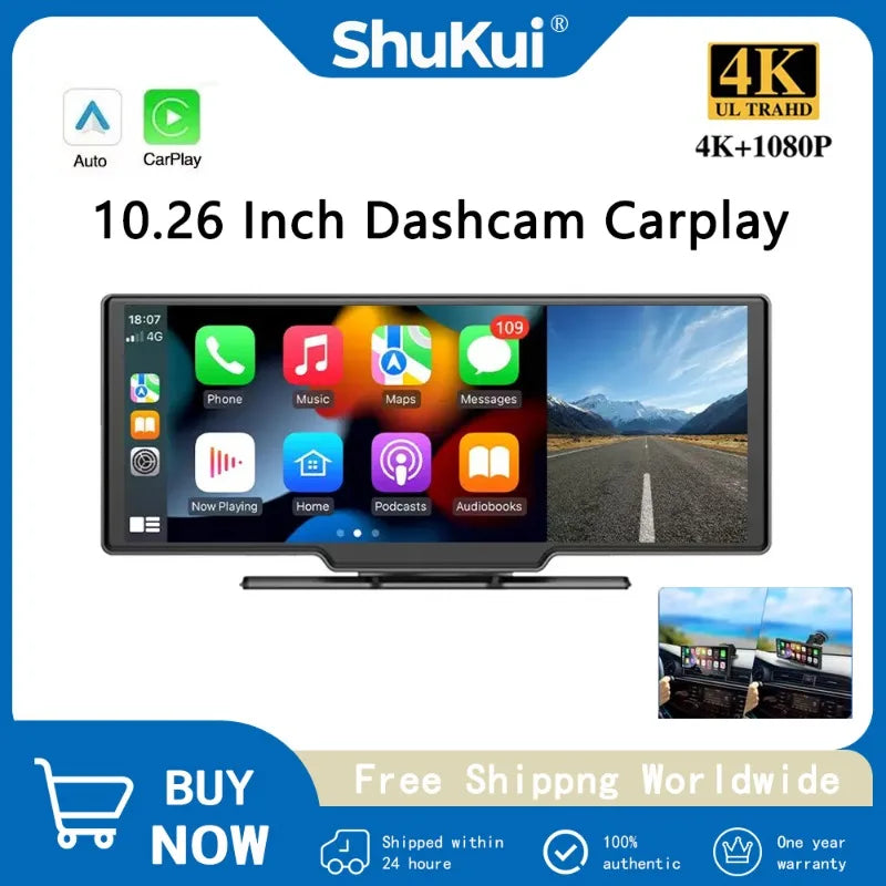 10.26"Car DVR with CarPlay&Android Auto,4K(3840*2160) Front and 1080P RearCamera,VoiceControl,BT,FM,GPS Recorder,DualLensDashcam