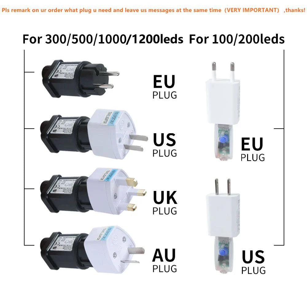- The product includes a 2M power cord, with flexible charging options via EU plug (for strings 30/50/100M/120M/200M) or USB+ small plug (for strings 10/20M).