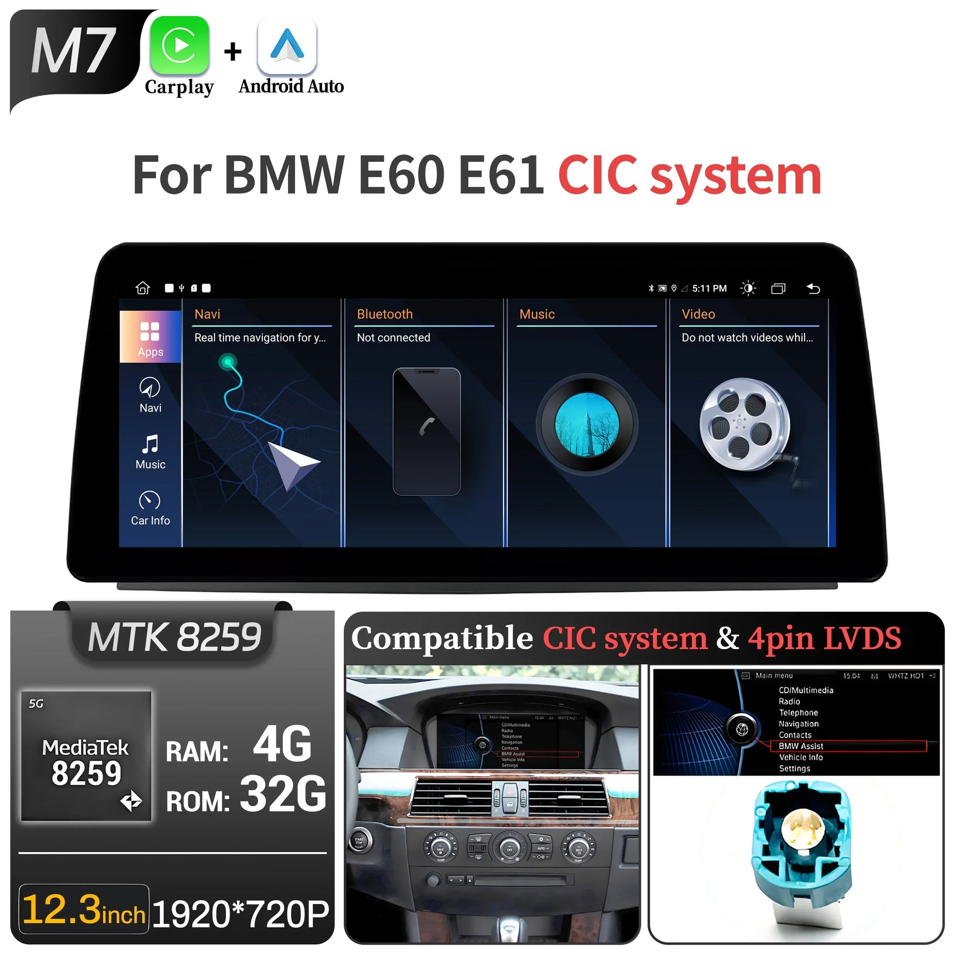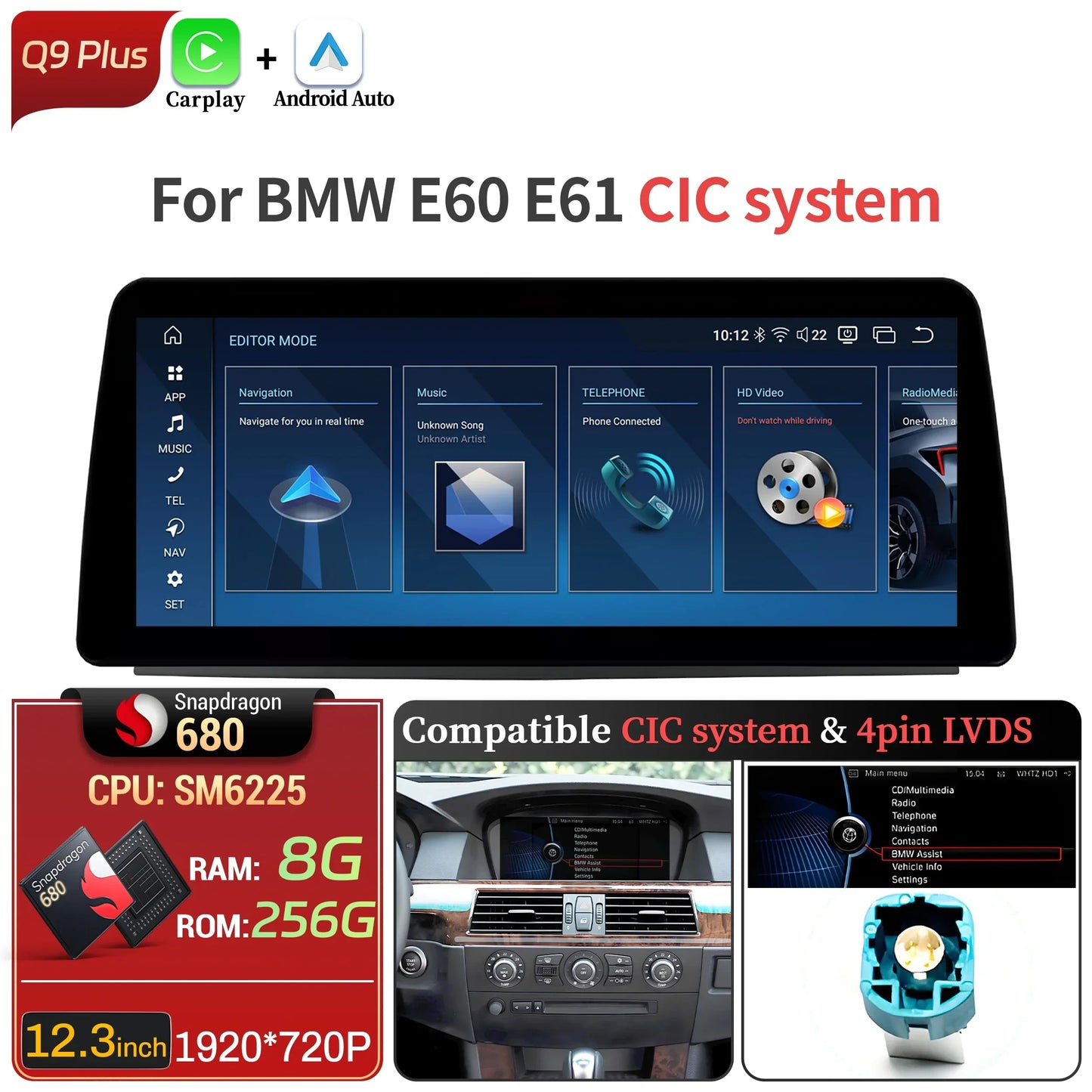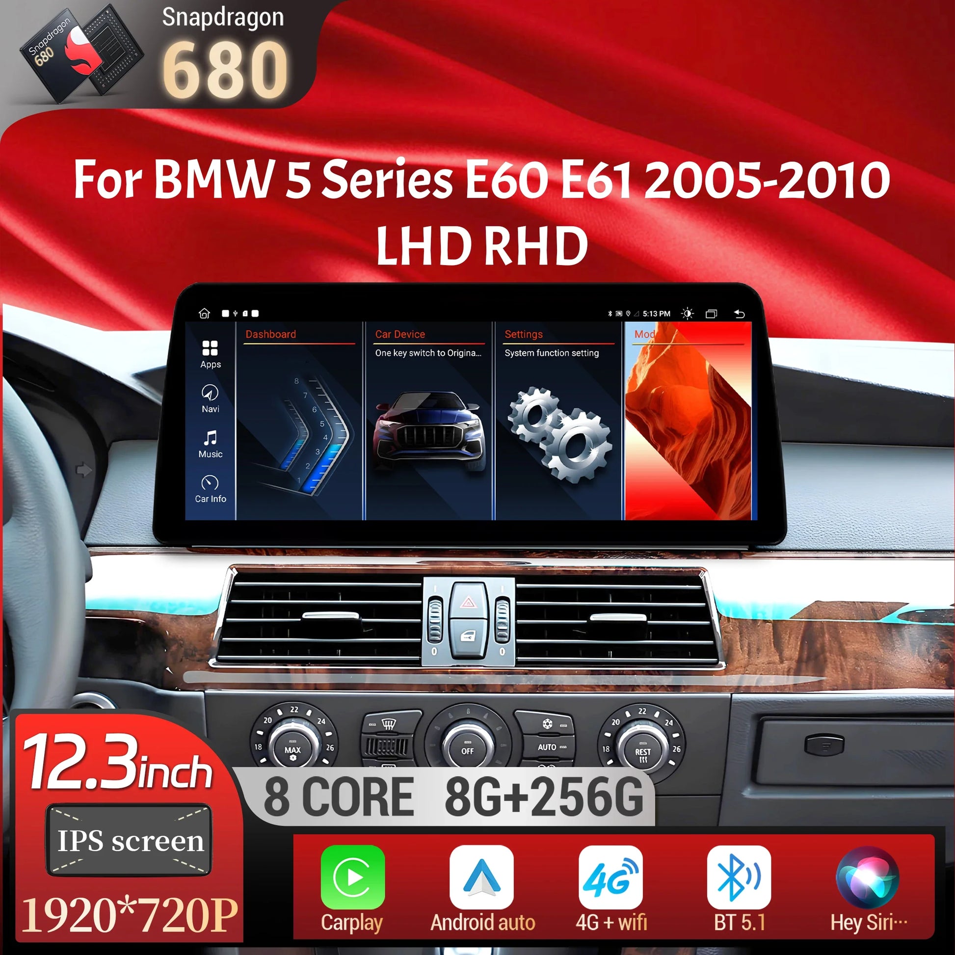 12.3 inch Android 14 For BMW 5 Series E60 E61 2005-2010 Car Radio 4G Wireless BT Carplay Snapdragon 680 Touch Head Unit Screen