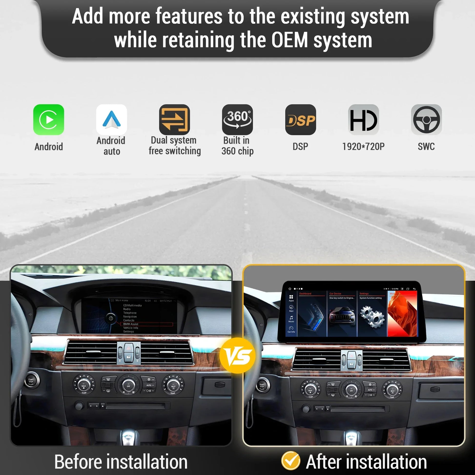 For BMW 5 Series E60 E61 2005-2010 ▶ Specifications: OS: Android 14 CPU: MTK 8259/Spdragon 668S(SM6125)/Spdragon 680(SM6225)