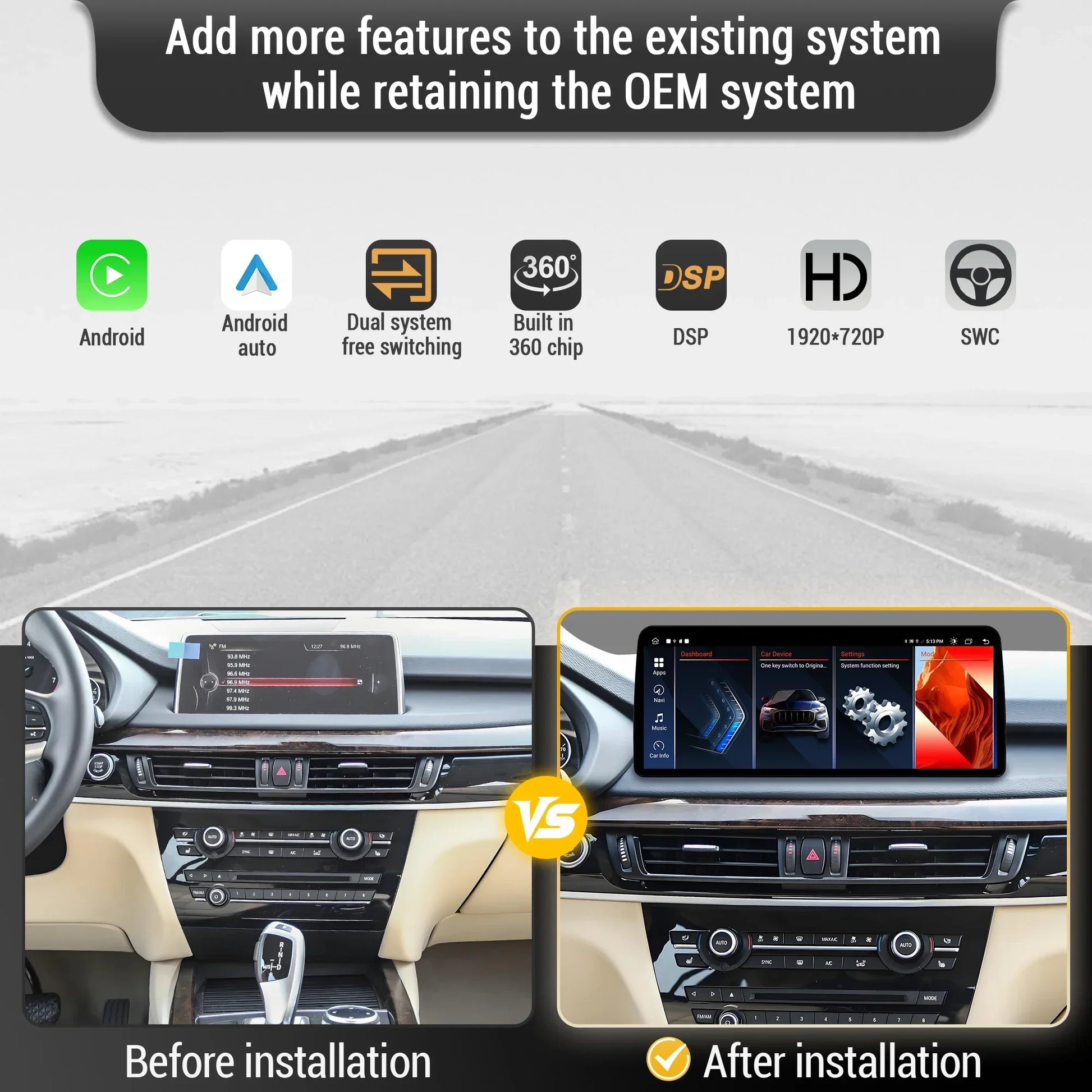 - Dual System, OEM and Android, Switch freely and support origil functions, Such as car information display, Parking system, Origil rear view camera ,radio, GPS vigation, Bluetooth, USB, etc
