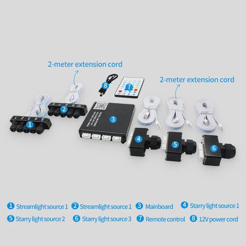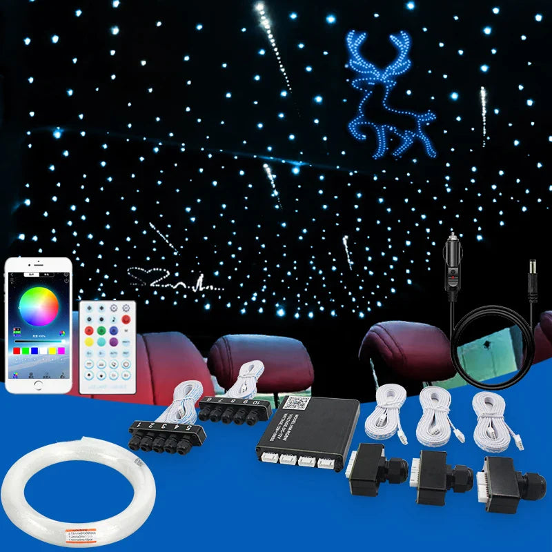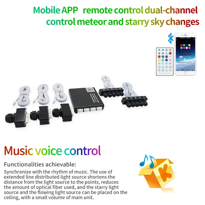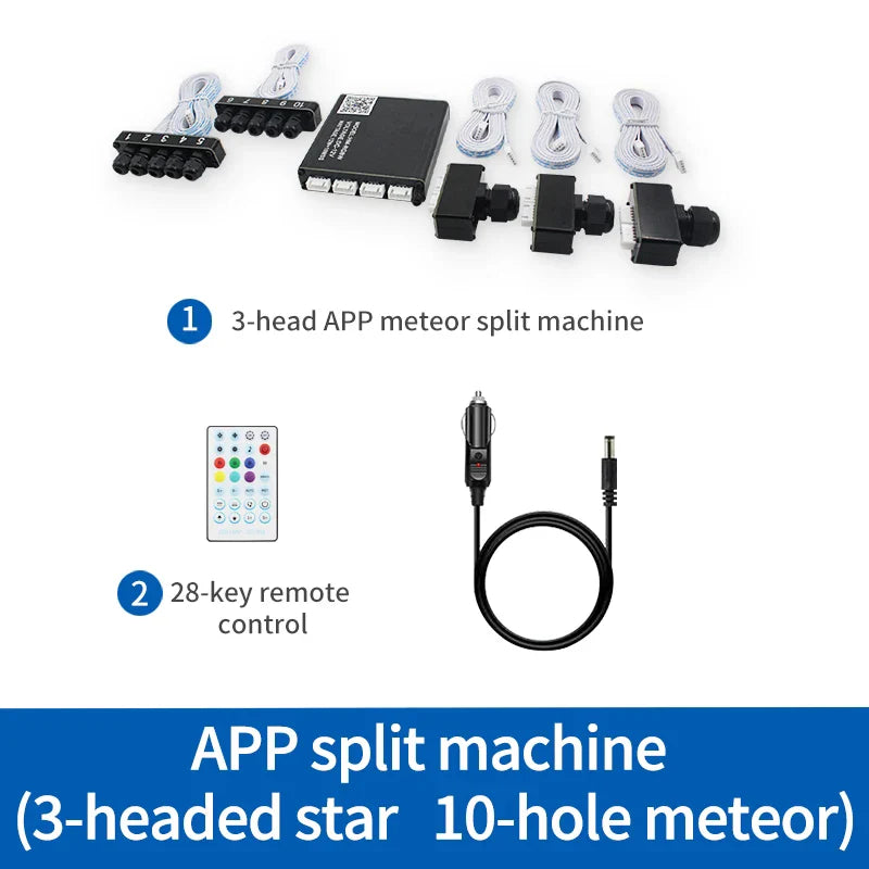 Kit me: 12v car app split meteor machine kit Features: high brightness, bright colors, complete functions, with breathing, with meteor all-in-one machine soft fiber Our transparent fiber optics are of superior quality, and the light source with rgbw lamp beads can emit a variety of brilliant light colors