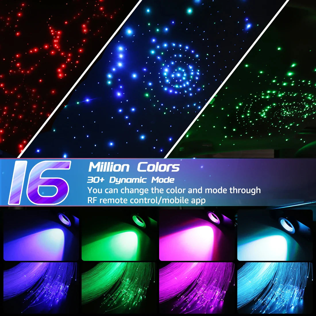 - 1.16W light source machine and PMMA plastic fiber.We provide 150pcs/300pcs/450pcs * 0.75mm * 2m fiber optic cables and complimentary tools.The light source machine is very compact, does not take up space, and is easy to hide