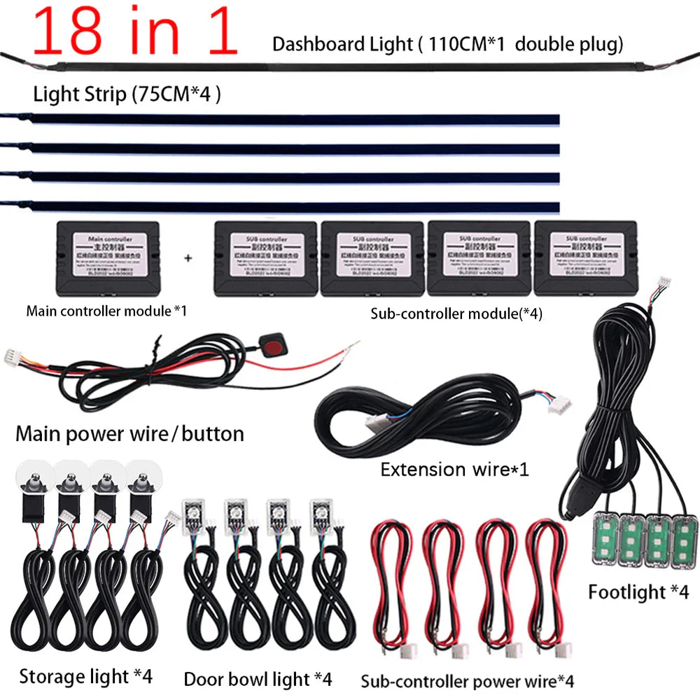 - Item Type : 18 in 1 ( 4* 75CM LED strip + 1* 110CM double plug LED strip+ 4 * Footlight + 4 * Door bowl lights + 4 * Storage lights)