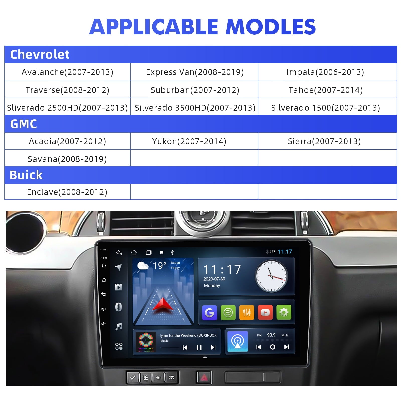 - 【NOTE】: Our Android car stereo just works for Chevrolet Avalanche(2007-2013) Express Van(2008-2019) Impala(2006-2013) Traverse(2008-2012) Suburban(2007-2012) Silverado 1500/2500HD/3500HD(2007-2013) Tahoe(2007-2014) GMC Acadia (2007-2012) Yukon(2007-2014) Sierra(2007-2013) Sava(2008-2019) Buick Enclave(2008-2012) Was not SiriusXM Compatible, Models and years just for your reference, Please confirm the shape and size of the center console before bidding