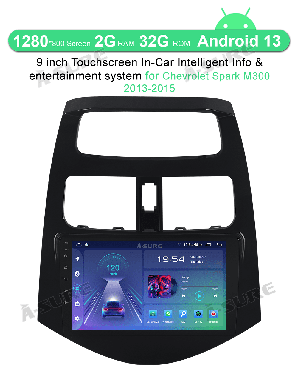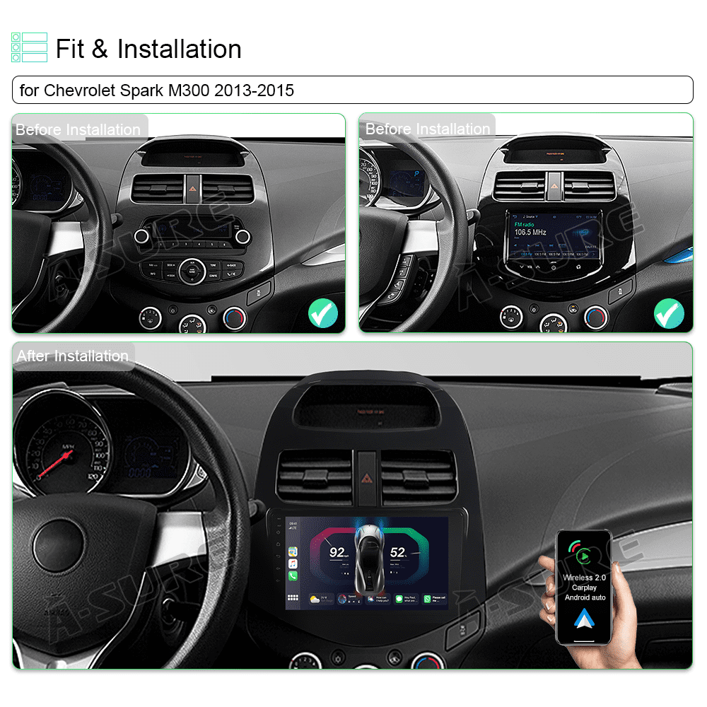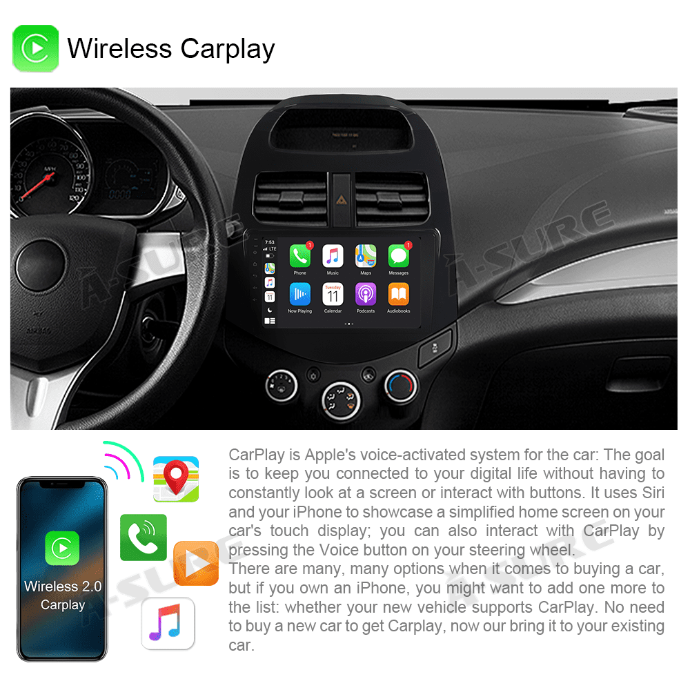Fit for: Chevrolet Spark M300 (2013-2015) Operating system: Android 13 Wireless Apple CarPlay, Wireless Android Auto