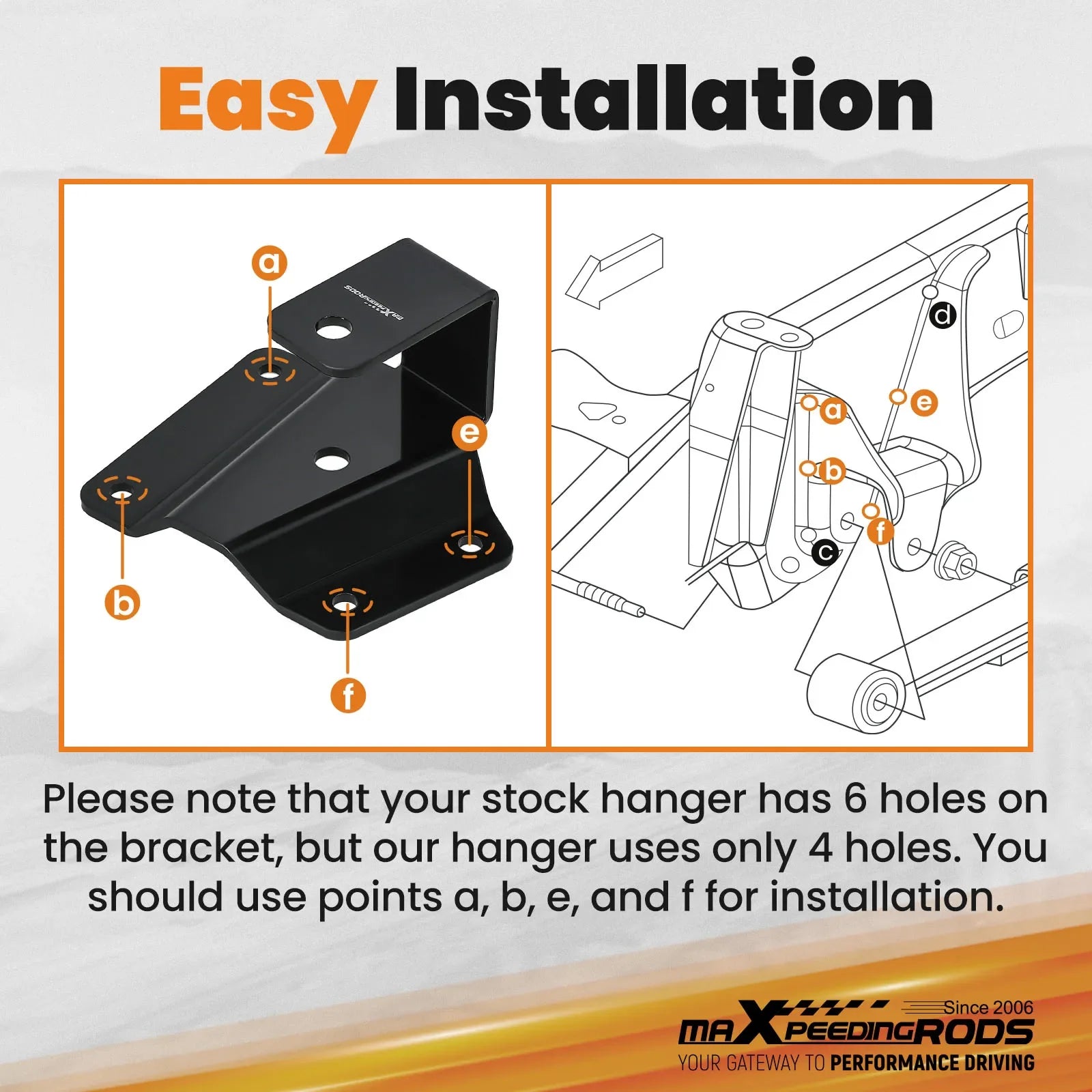 - Installation Note: Please notice that your stock hanger gets 6 holes on the bracket, but our hanger only uses 4 holes
