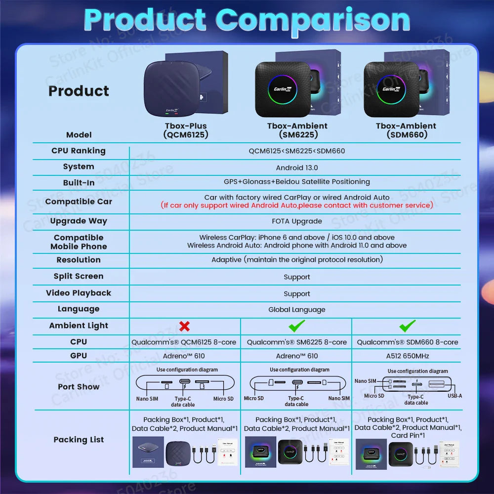 >>>About Android Ai Box Android 13 system, support wireless CarPlay ,Wireless Android Auto,you can choose between two systems: Click the "Autokit" icon to access Wireless CarPlay or Wireless Android Auto Compatible with iPhone and Android phones,do not need worry your phone could not use it Built in Qualcomm processor, low power consumption, high performance,