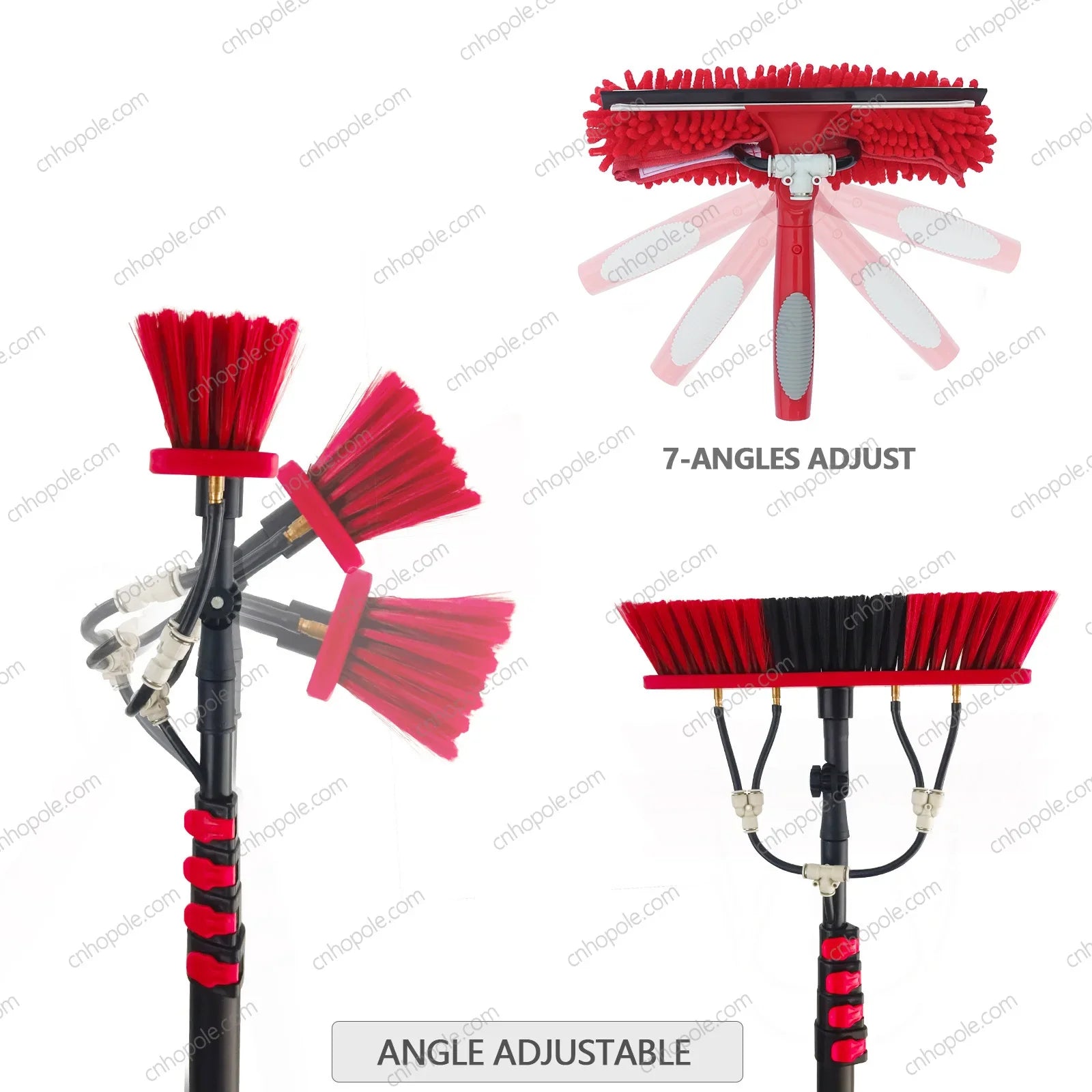 - Non-slip sponge comfortable handle.PP bristle material and full brasshose connector, durable and beautiful.The design of the water pipe passing through the middle of the pole makes it very easy to unfold and fold.The nylon material angle adapter allows the brush head to be flexible to achieve the cleaning angle.Microfiber window squeegee with scrubber removes dirt and grime,flexibility at multiple angles for any window pane