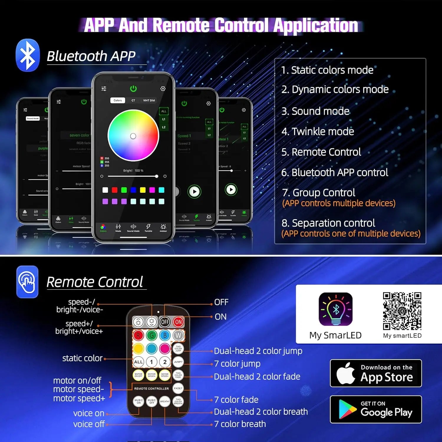 - 20W is a built-in dual color port, that easily chooses a different color or the same color between two led ports, even different dymic and music modes, widely used in headliners of cars, homes, clubs, KTV, or star ceilings in living rooms, bedrooms, hotels, etc