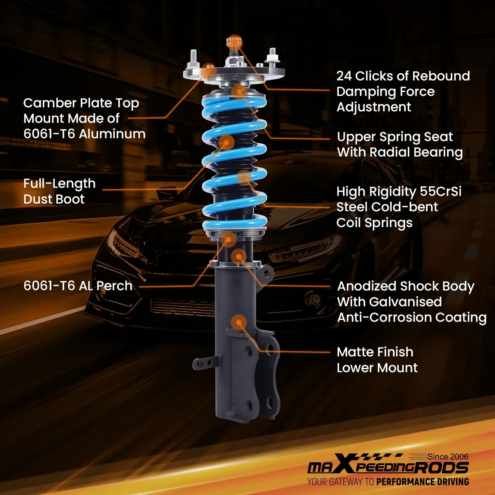 MaXpeedingrods T6 lowering coilover, features 24 clicks adjustable rebound damping, independent ride height and spring tension settings, developed high viscosity index damping oil, 55CrSi steel cold-bent springs and decent outlook to provide balance between comfort and performance This suspension system is ideal for daily driving and occasiol, light track use components are adopted to ensure product durability and stability Each application is fully test fitted and completely road tested to guarantee all our customers performance and comfort expectations
