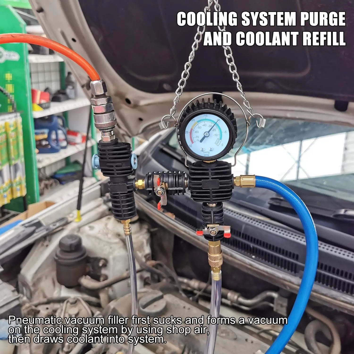 1. All-in-one integrated coolant pressure tester fill kit includes leak detection, temperature measurement and coolant fill functions. The radiator pressure tester applies pressure to the reservoir/cap and observes the needle drop over time to confirm system leaks. The coolant vacuum fill tool uses a vacuum pump to extract air, creating a vacuum that draws coolant into the cooling system. Coolant is added under vacuum without large air pockets to avoid engine distortion or other damage.