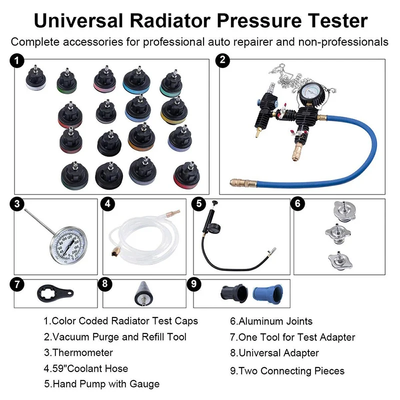 2. The cooling system pressure tester and coolant bleed kit is equipped with 17 specific adapters and 1 universal tapered rubber adapter for almost all types of radiator openings on classic and modern vehicles. Included are 3 radiator cap test adapters and 2 connectors to help diagnose radiator cap leaks on most vehicles. All these adapters are color coded and specially placed for easy and unconfusing selection according to the marked pictures in the instruction manual.