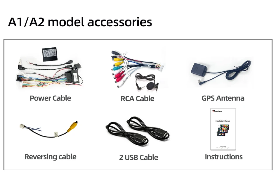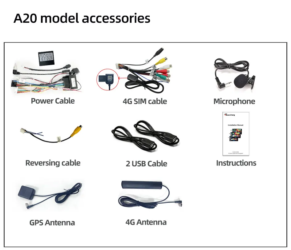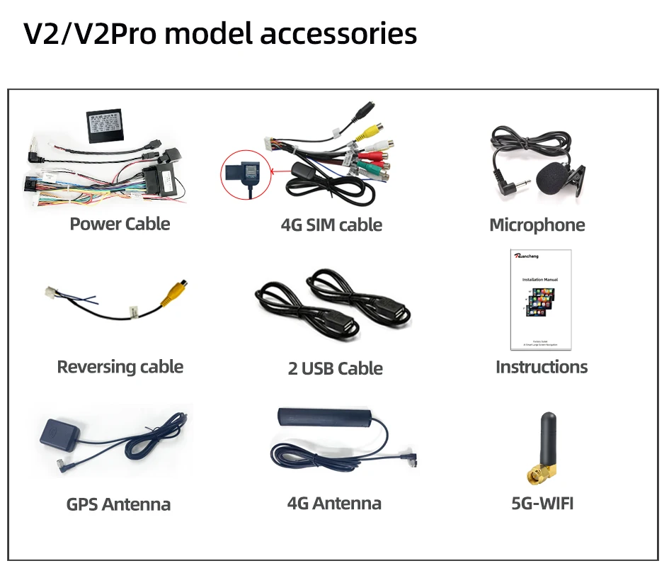 ① Frame ② Machine ③ Power cord ④ 4G SIM Cable ⑤Reversing cable ⑥ 2 x USB cable ⑦ Instructions ⑧ GPS Antenna ⑨ 4G Antenna ⑩ 5G-WIFI