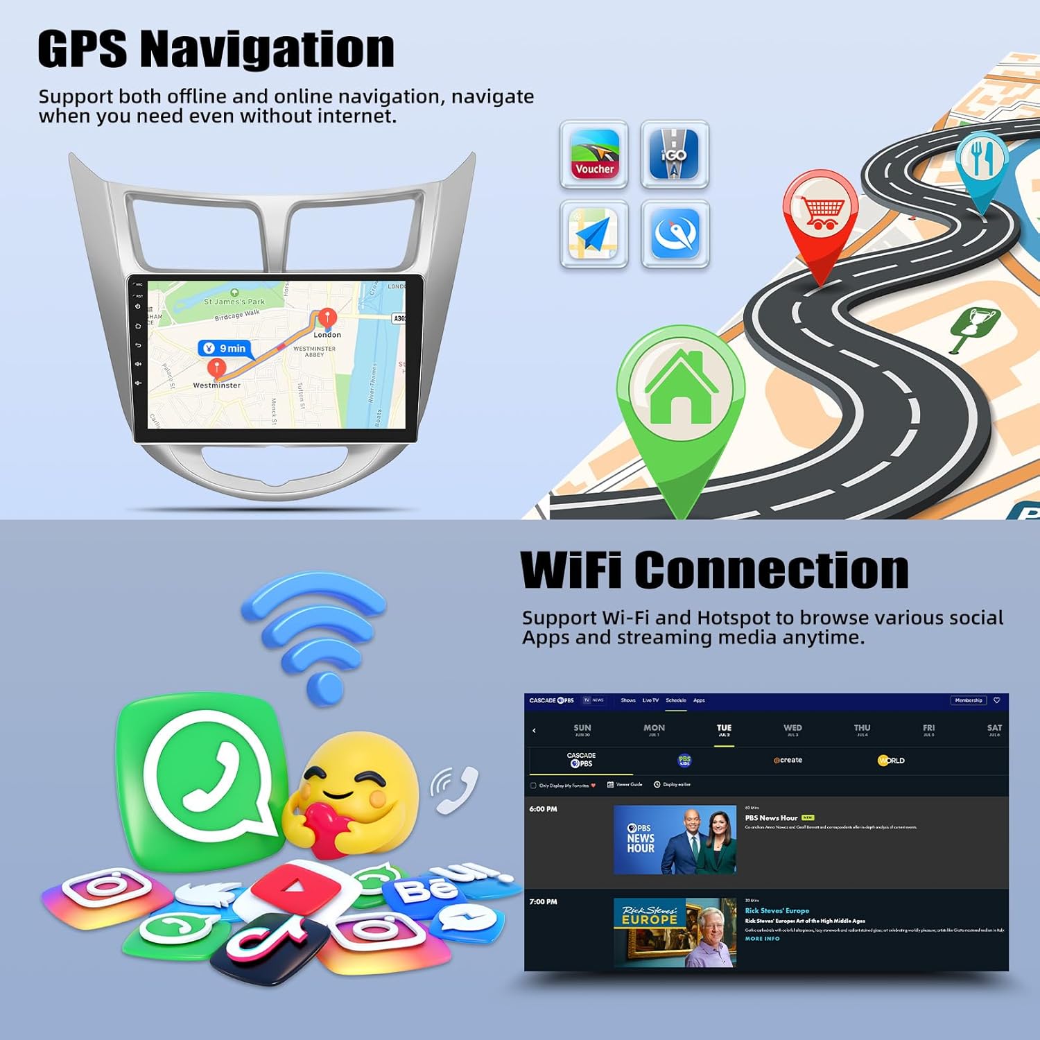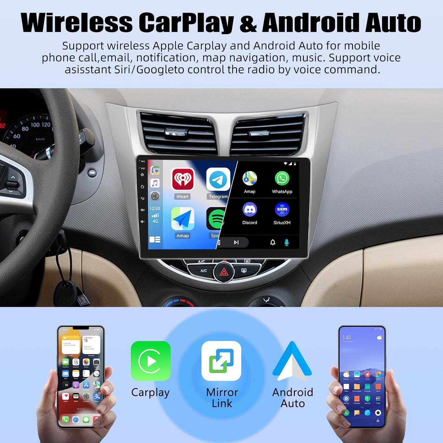 CarPlay for IOS: Apple Carplay is a car-computer interaction system specially customized for iPhone, for operating Apps from your phone such as navigation, telephone, music, radio, etc. on the 9 inch touch screen car stereo.