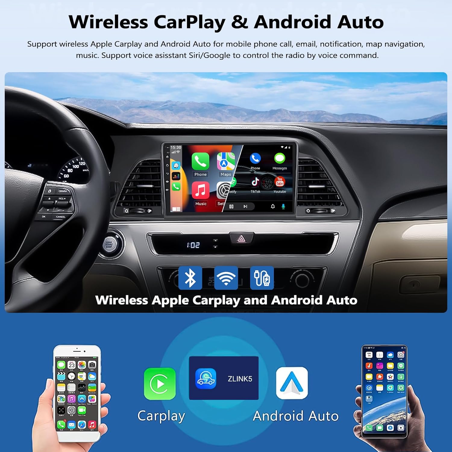 Built-in wireless Apple Carplay and Android Auto, 9" Android 13 car stereo with 2GB RAM+32GB ROM, GPS and WiFi module, support Bluetooth hands-free, FM/RDS, backup camera, mirror link, is compatible with