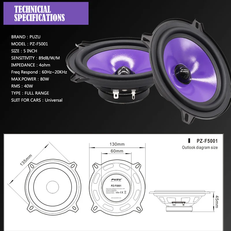2pcs 5 Inch 80W Full Range Frequency Car Audio Speaker Heavy Mid-bass Ultra-thin Modified Speaker Non-destructive Installation
