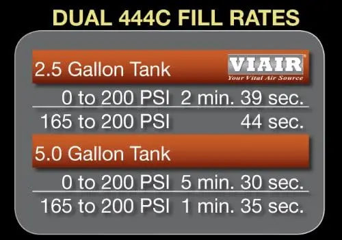 - PNEUMATIC APPLICATIONS: Not only can the 444C replenish your tank after heavy air suspension use, it can power any air tool in your shop or be used for tire inflation. Consider this model a jack of all trades in high performance compression. Fills a 5 gallon tank from 0 to 200 PSI in 5 min 30 sec.