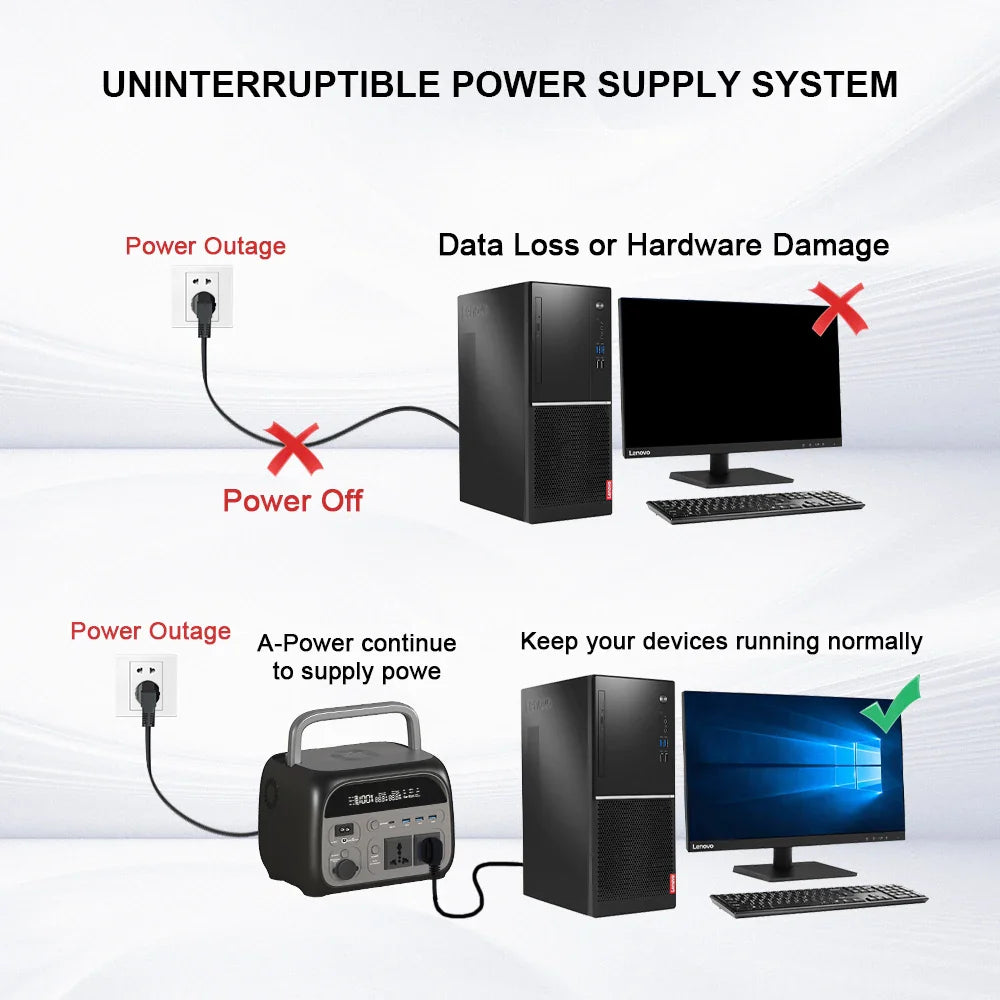 To start the UPS function, you need to turn off the power of the product first,connect it to the grid power, press and hold the grid power switch for 3seconds, and after it is turned on, short press the AC switch. The icon is asshown in the figure, the UPS function can be turned on, it can be chargedand discharged at the same time, it supports the priority of the mains, andhas the function of UPS uninterrupted power supply.