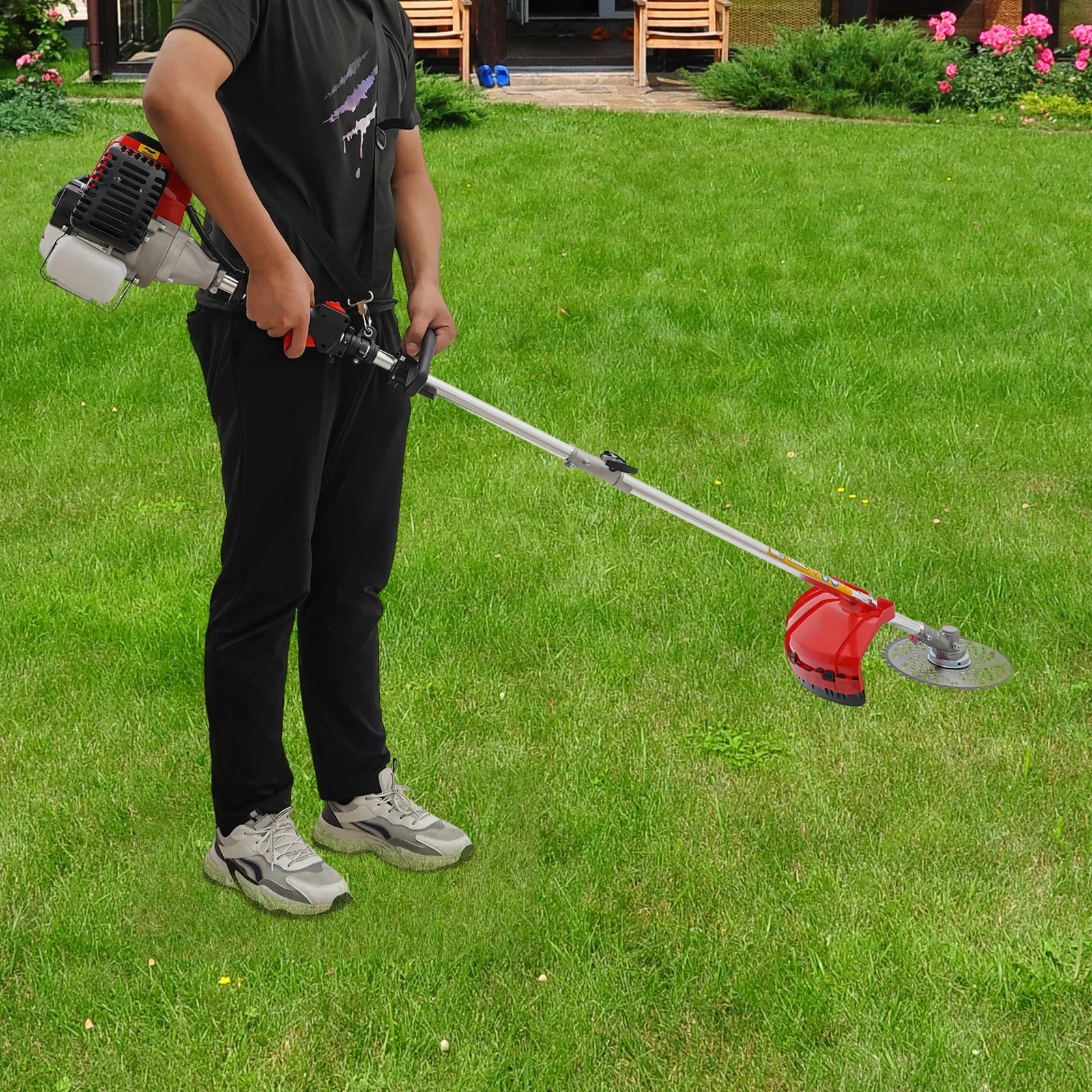 This mower is powered by a powerful 52cc two-stroke engine that cuts grass and brush quickly. Its well-designed blades sweep across all kinds of uneven terrain, its shoulder strap and handle make maneuvering more comfortable and stable, and its easy-to-understand starting system allows for easy operation. It is an efficient, versatile and durable gardening tool that will become a must-have in your gardening toolbox!