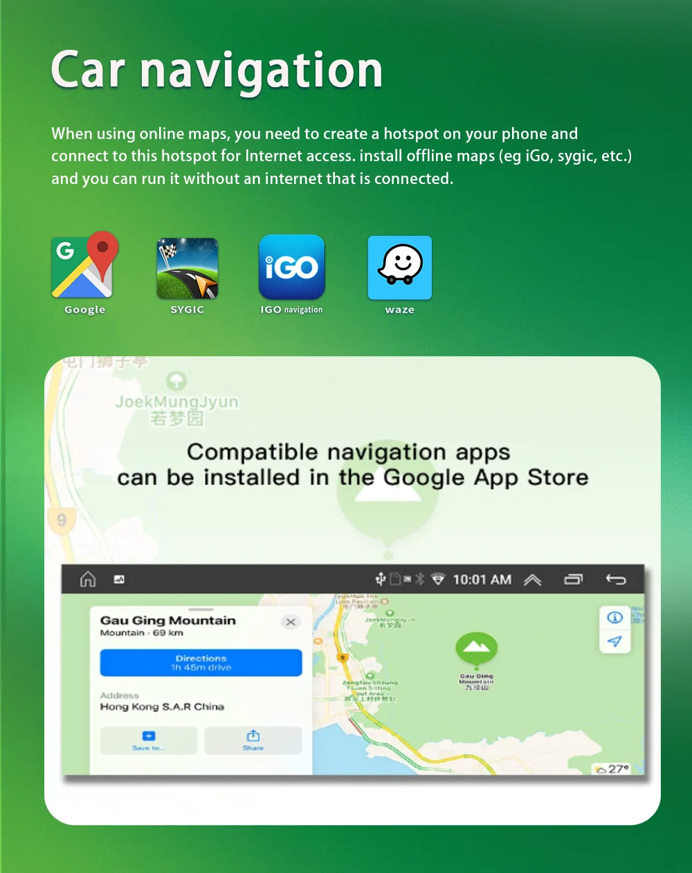 7. Built-in GPS Off-line Map, and Support Online Map,support Google map ,iGO, Sygic,Tomtom and so on .
