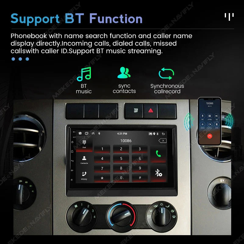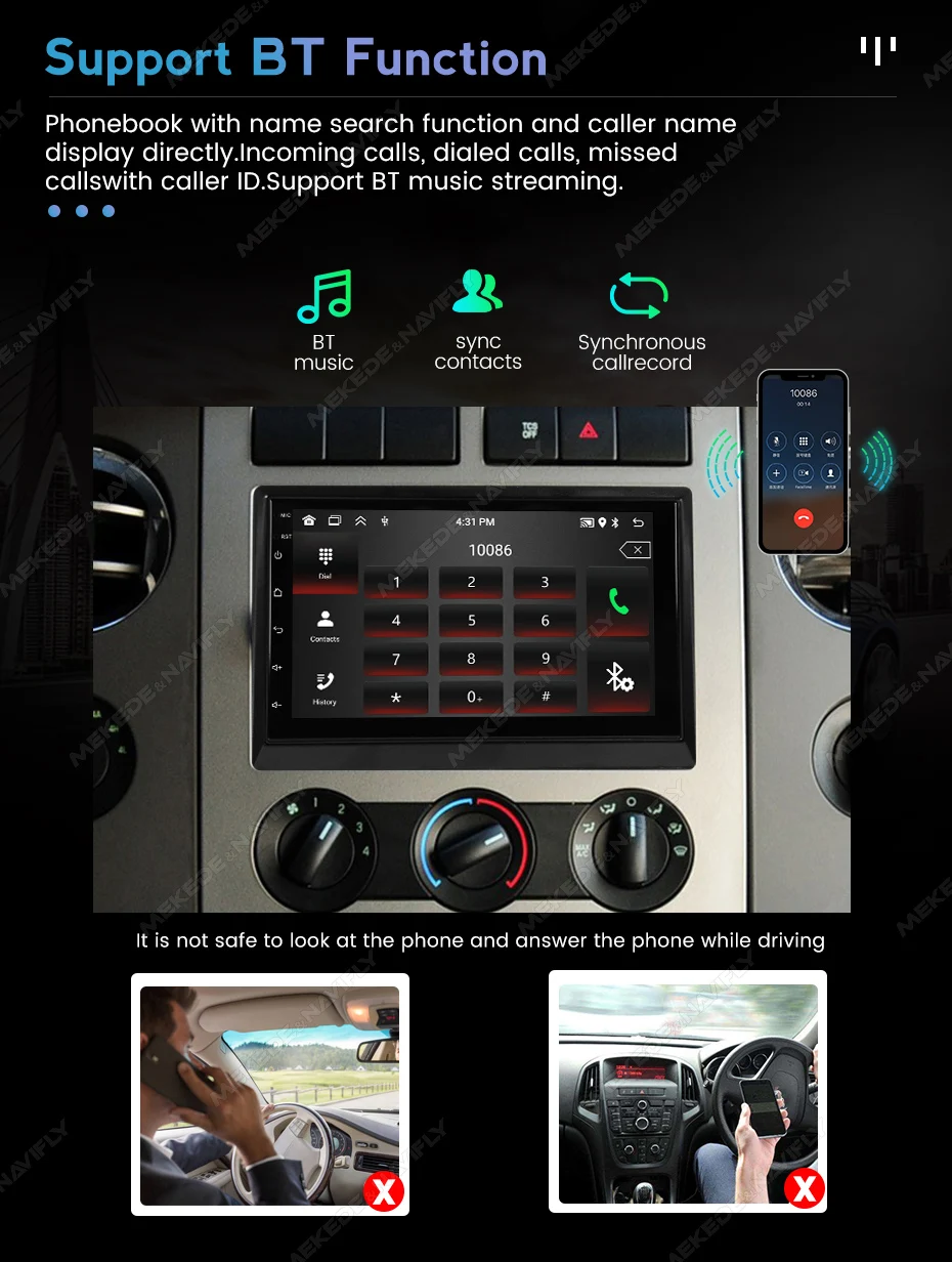 Phonebook with name search function and caller name display directly.Incoming calls, dialed calls, missed calls with caller ID.Support BT music streaming.