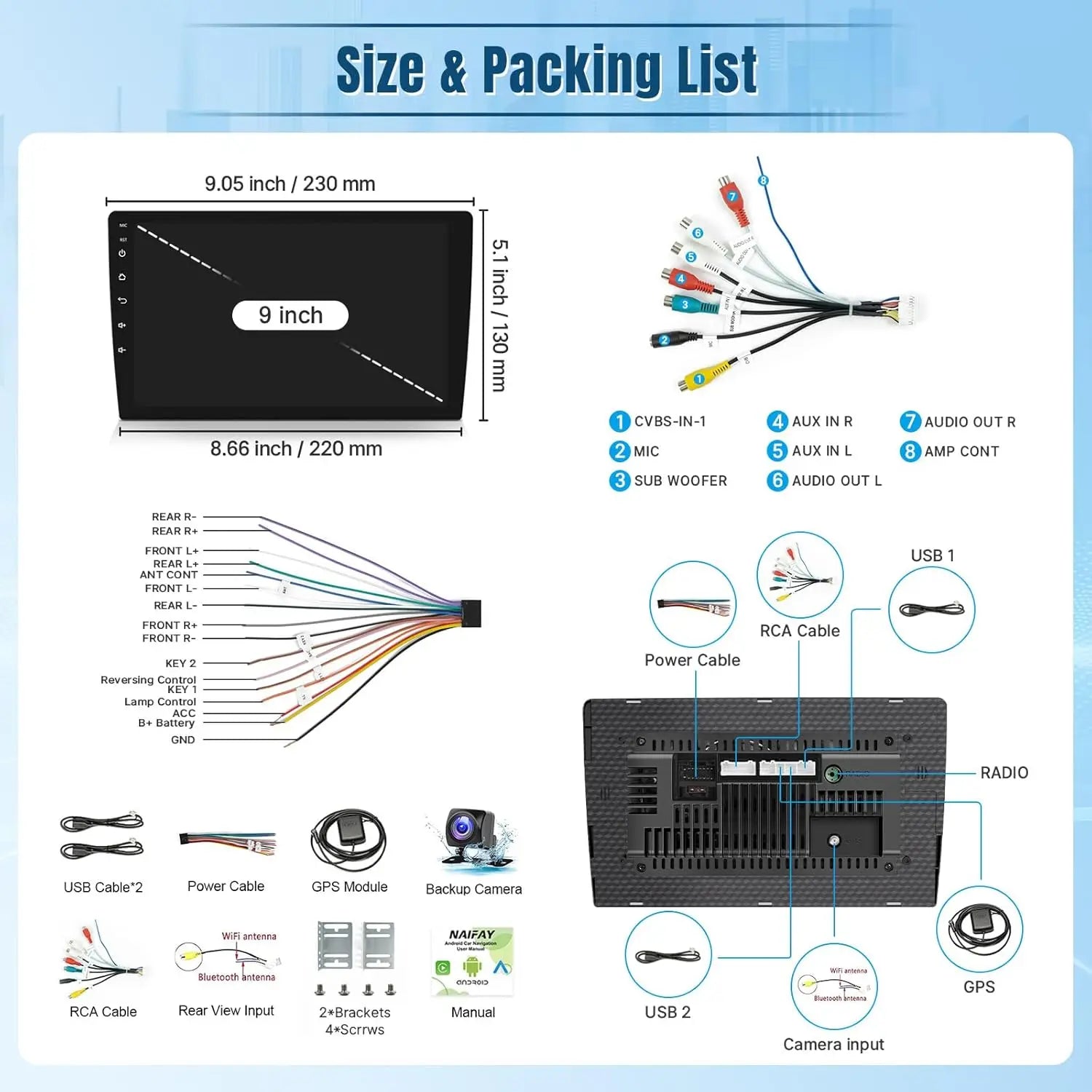【Android Double Din Car Stereo】Android head units with installation size of 178(L)*65(W)*70(H)mm/7.01(L)*2.56(W)2.76(H)in (Standard 2 din opening size.). Fits for most general purpose 2 din car center console. 9 inch capacitive 2.5D tempered glass touch screen, with high resolution 1024*600, support 1080P video playback, bring you visual enjoyment.