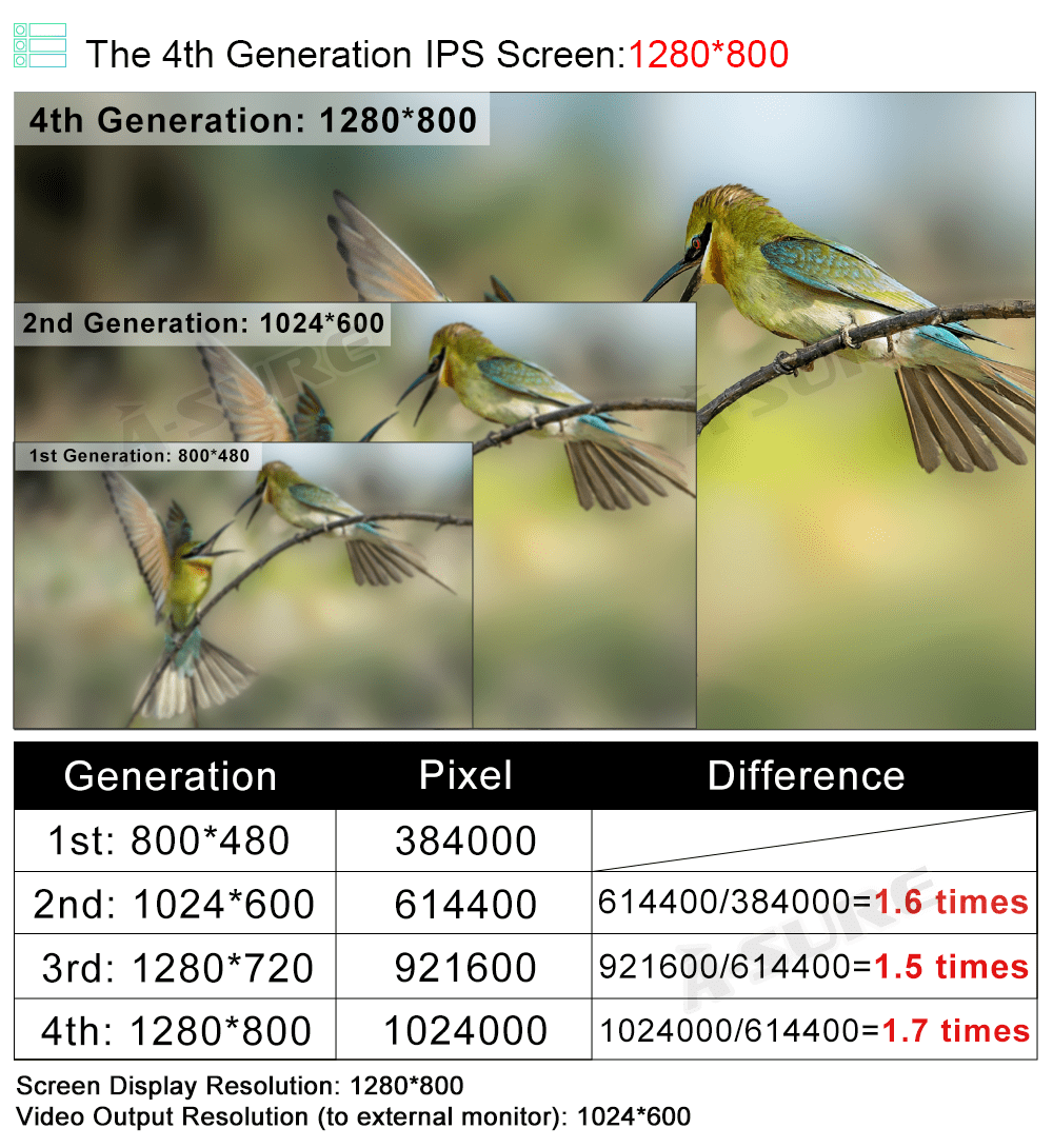 - 1280*800 HD Resolution Screen, the 4th generation display technology; Video output to external monitor with resolution 1024*600