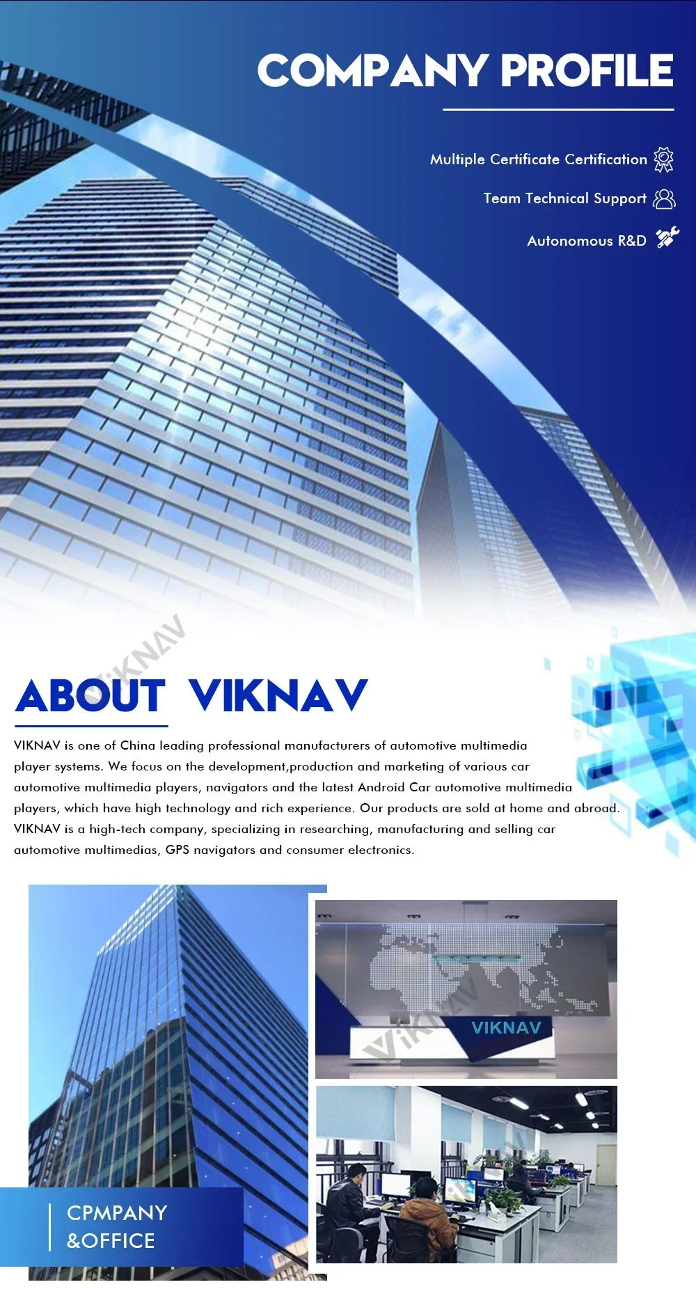 VIKNAV is one of China leading professional manufacturers of automotive multimedia players systems.We focus on the development,production and marketing of various car automotive multimedia players etc. Our products are sold at home and abroad.VIKNAV is a high-tech company,specializing in researching,manufacturing and selling car automotive multimedia,GPS navigators and consumer electronics.