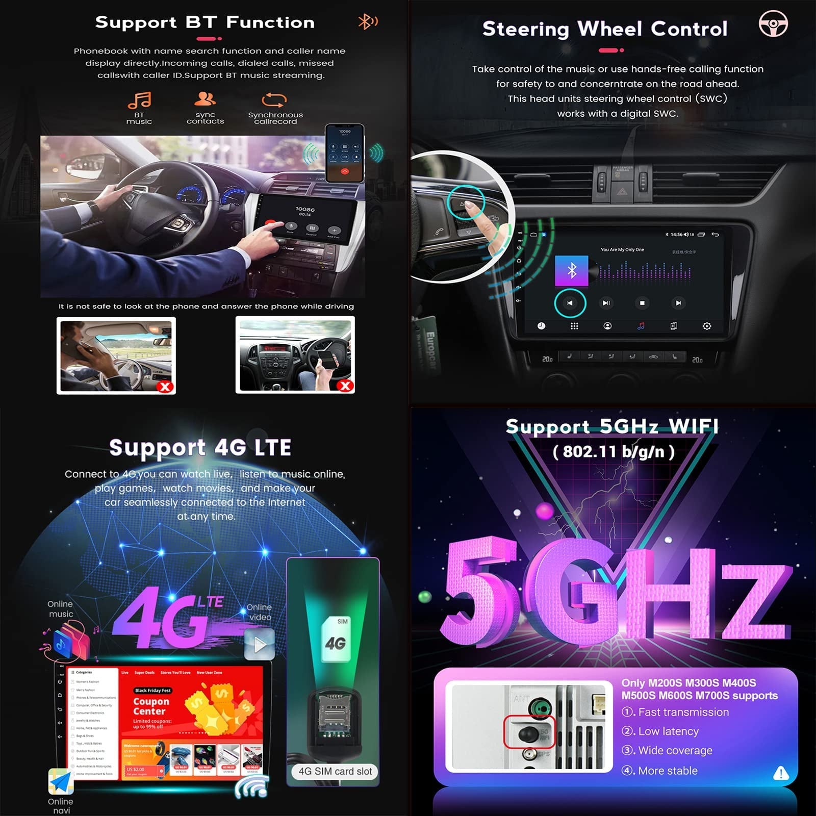 [Multi-function satellite navigation]: GPS satellite radio with integrated microphone, GPS/Bluetooth 4.0/5.0 (music and hands-free calling) 5GWLAN/4GLTE/1080P video/RCA full output/USB/large IPS touch screen/mirror connection/steering wheel operation/. Image/vehicle info/multi-language/plug and play, support external connection ADAS DVR/TPMS/OBD2/DAB+/CARPLAY/dash cam etc (optional), AHD rear view camera 720P (complimentary).