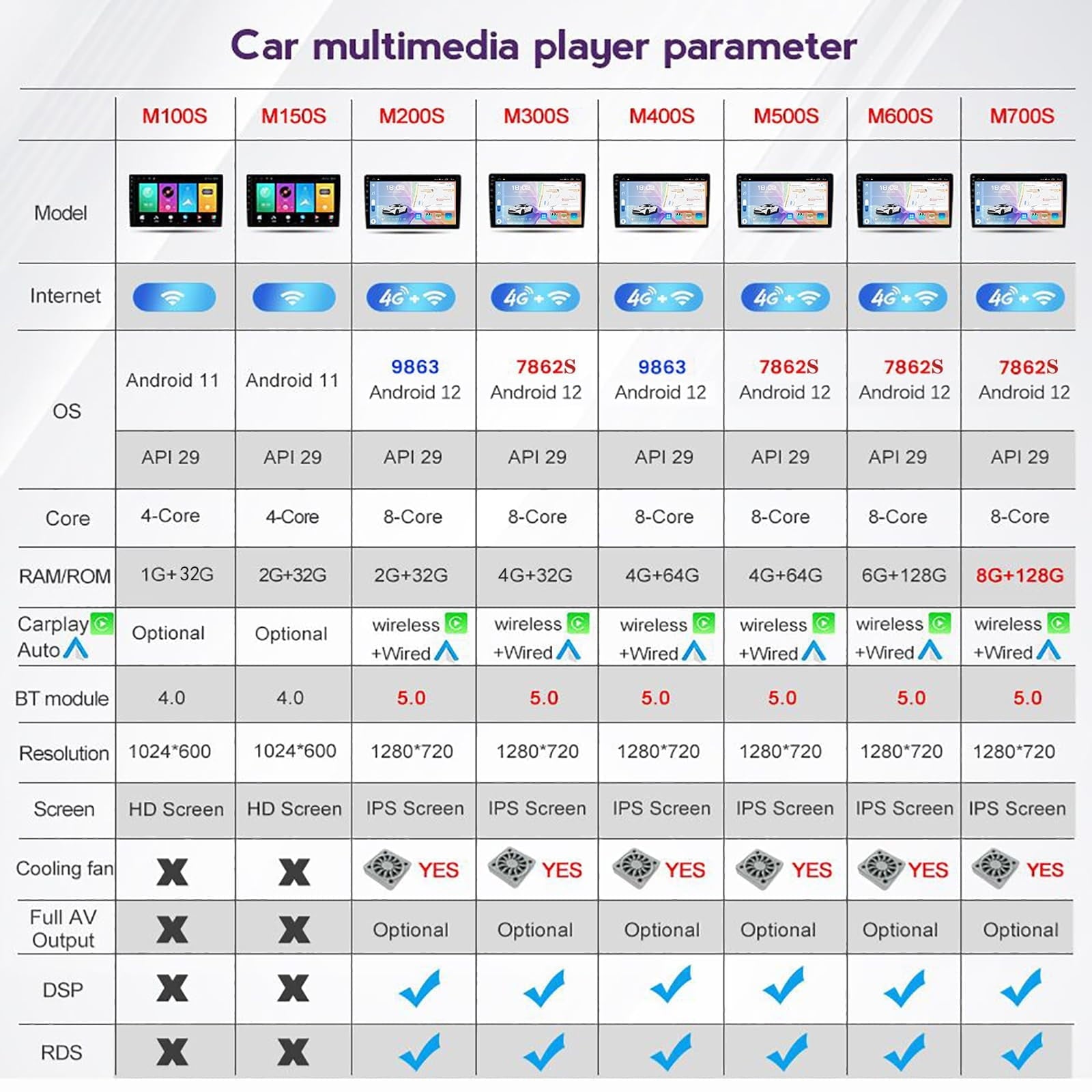 [Android Car Audio]: Android touch screen is the latest Android 10.0 or Android 12.0 (API 29) (M100S: 4 core WiFi 1+16GB, M150S: 4 core Wifi 2+32GB) (M200S: 8 core 4G LTE/5G Wifi 2+32GB, M300S: 8 core 4G LTE/5GWifi 3+ 32GB, M400S: 4GLTE 5G Wifi 4+64GB, M500S: 8-core 4G LTE/5G WiFi 4+64GB, M600S: 8-core 4G LTE/5G Wifi 6+128GB, M700S: 8-core 4 G LTE/5G WIFI 8+128GB), only the 8-core has built-in wireless Carplay Android Auto.