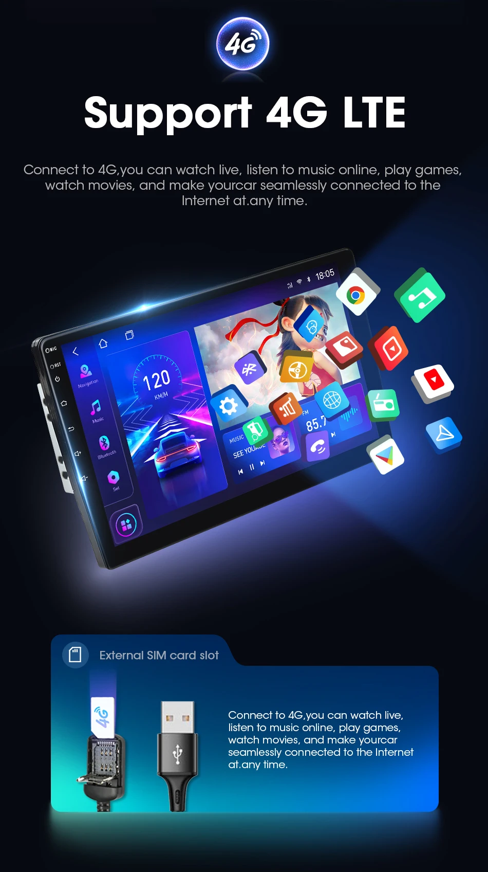 This android car radio has apple carplay and android auto functions, you can choose wireless or wired connection(wifi/usb), and then you can use part of the mobile phone software, navigate, listen to music, play arc, use “siri” voice control function.