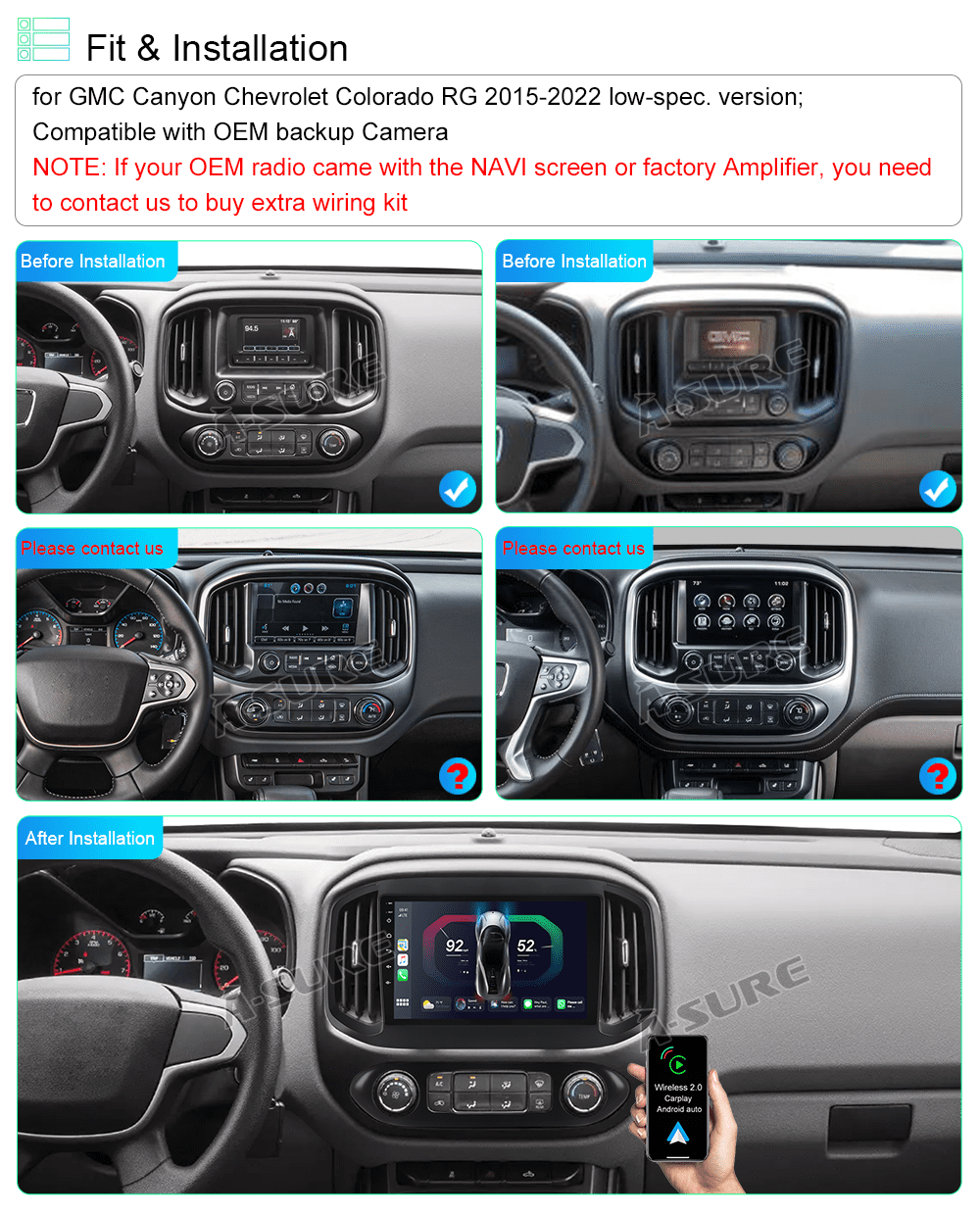 【Compatibility】Fits for GMC Canyon Chevrolet Colorado RG 2015-2022 (low-spec. version); Compatible with OEM backup Camera.NOTE: lf your OEM radio came with the NAVl screen or factory Amplifier, you need to contact us to buy an extra wiring kit.