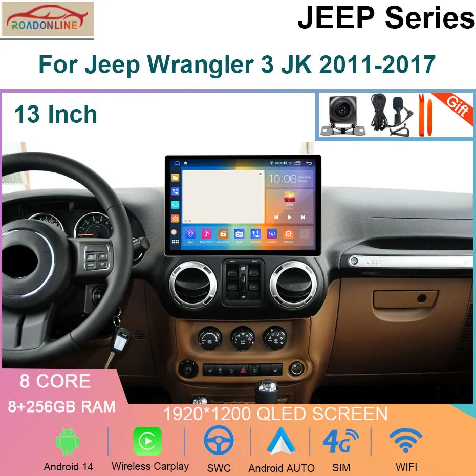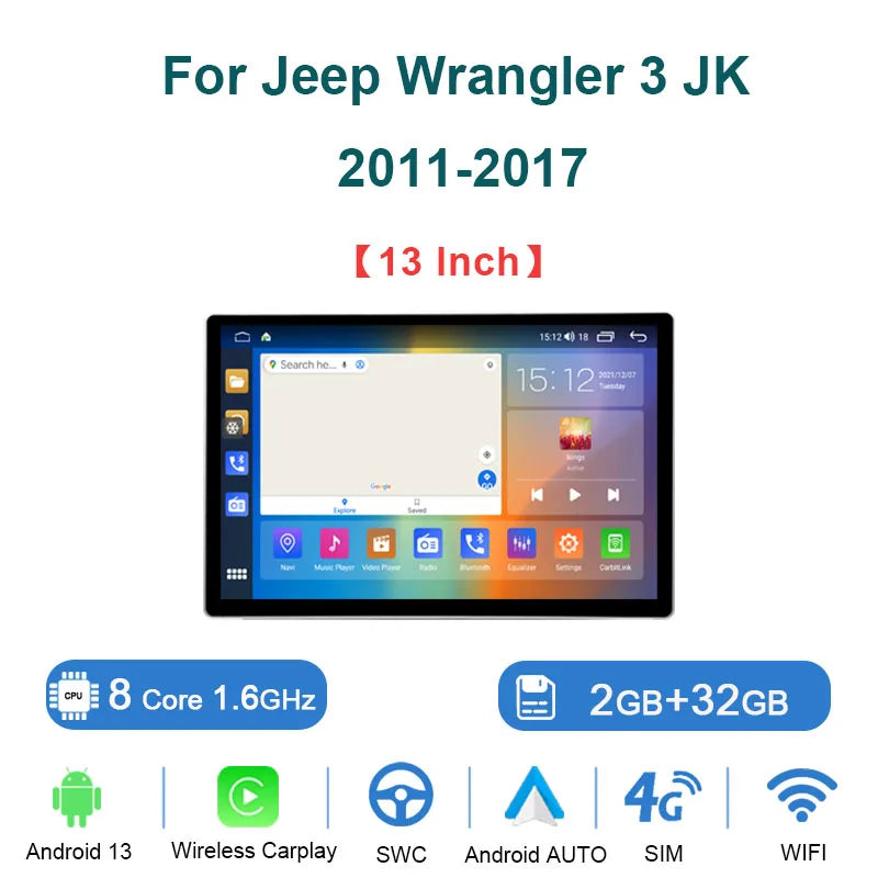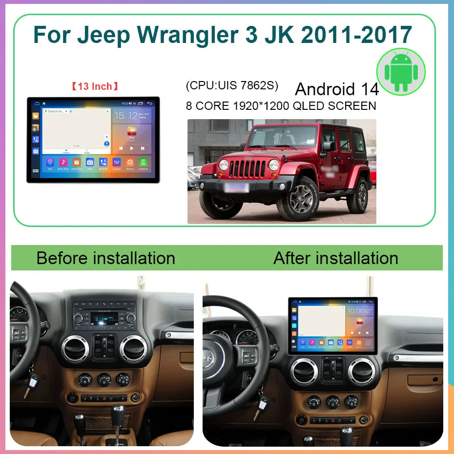 Android 14 8+256GB 13 INCH 2K Screen Car Radio For Jeep Wrangler 3 JK 2010-2018 GPS Multimedia Player Carplay GPS Stereo 4G