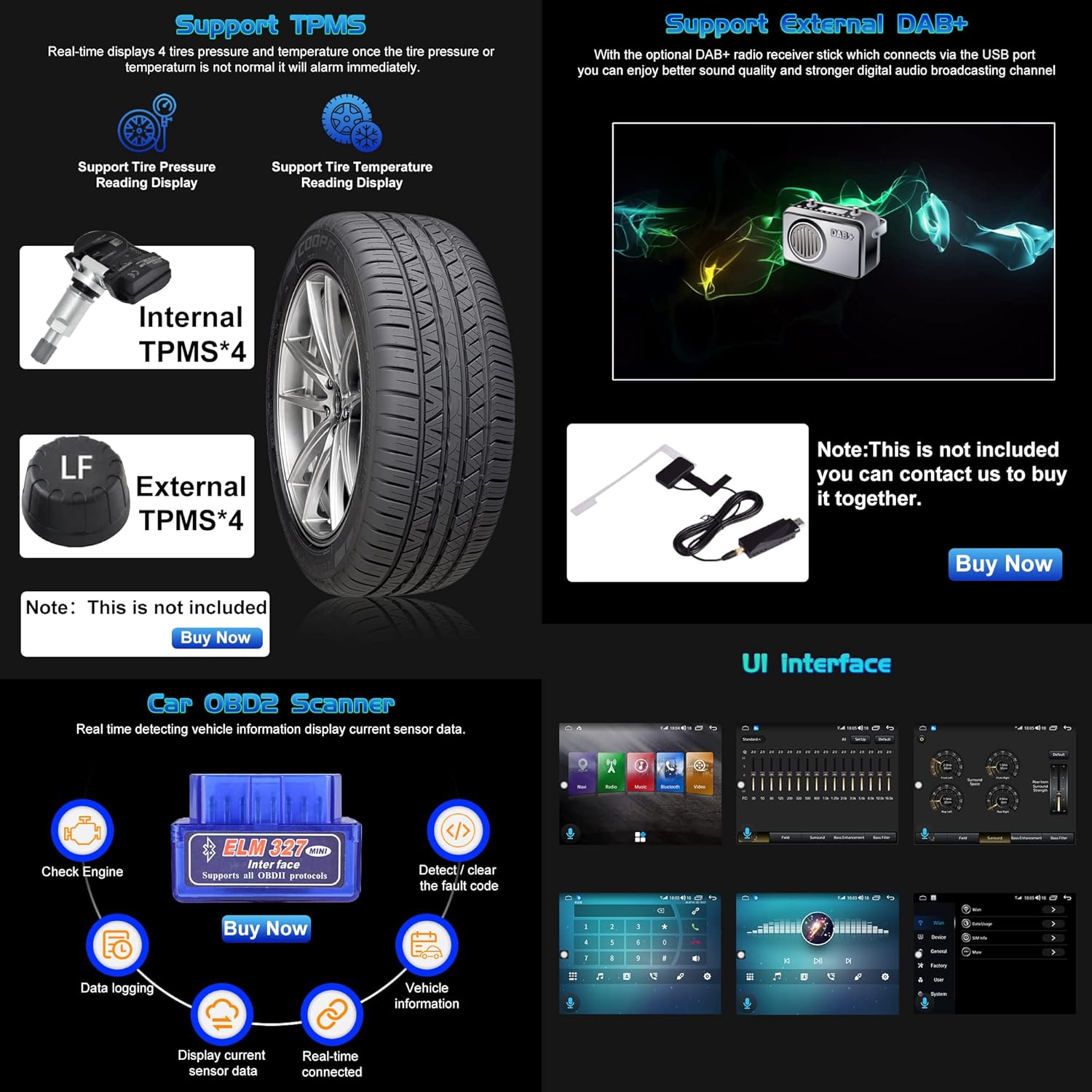 Optional Accessories (Not included in the package): DVR, OBD, TPMS, DAB, External microphone.