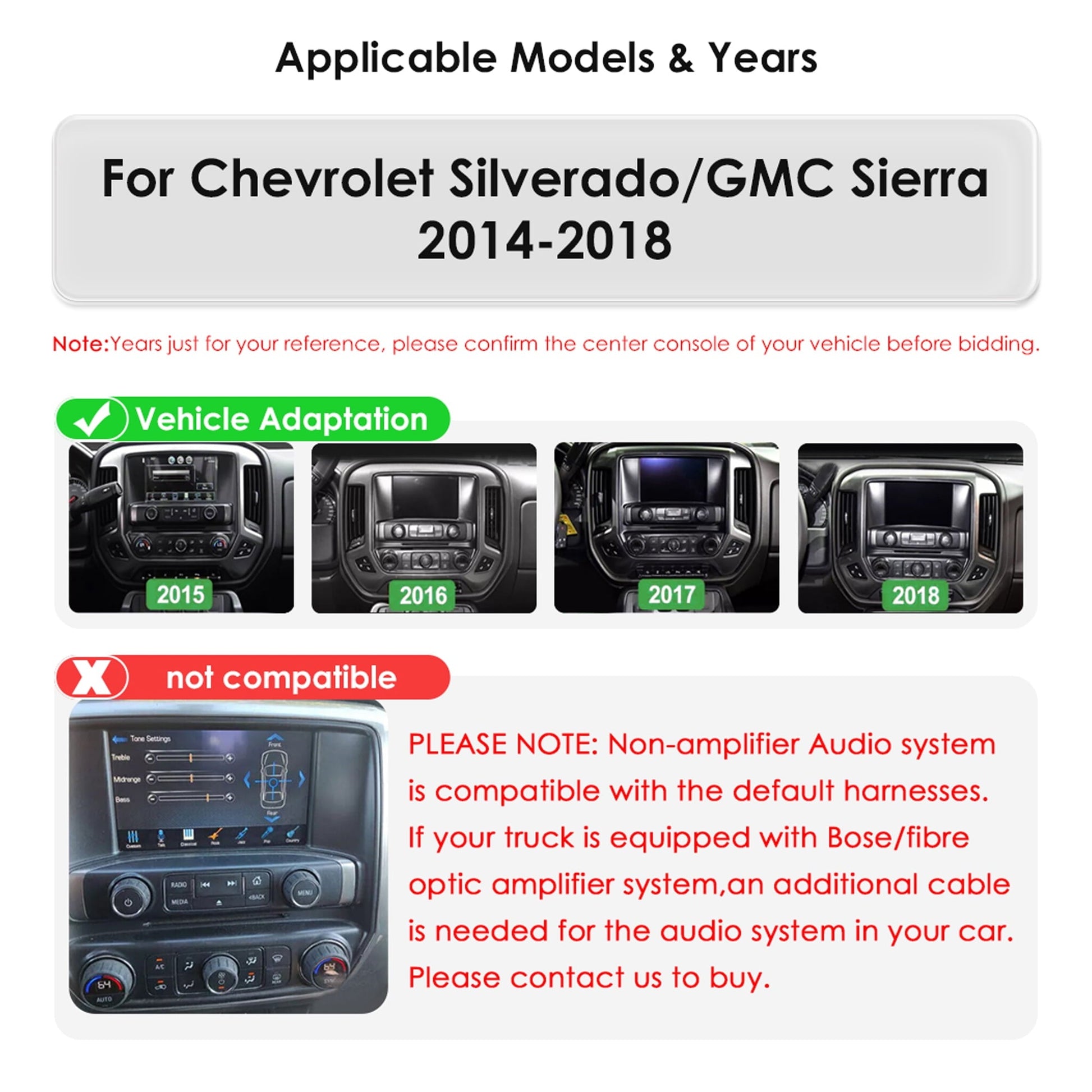 Compatible Vehicles: GMC Sierra 2014 2015 2016 2017 2018/ Chevrolet Silverado 2014 2015 2016 2017 2018 Note: Before you make the purchase, please check if your car model is on the compatible list. This unit is a 2 din radio with 10.1" touch screen. You can watch videos and listen to music on this unit. It's running Android 13 system, so most of Android Apps can be used on this unit, such as Youtube, Google Chrome, Facebook, etc. This unit also has the built-in GPS navigation system. Bluetooth, Wifi and hotspot connections are supported on this unit as well. The steering wheel control can work with this unit if your car model is on the compatible list.