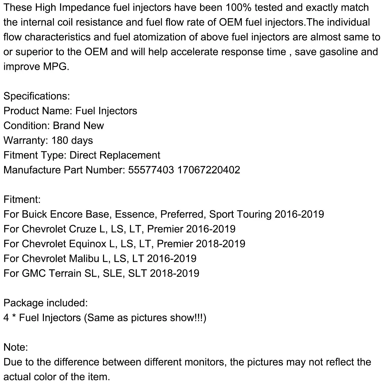 Areyourshop 4PCS Fuel Injectors 55577403 Fit for GMC 16-19 Fit for Chevry Cruze Malibu 1.4L 1.5L L4 Car Accessories Parts