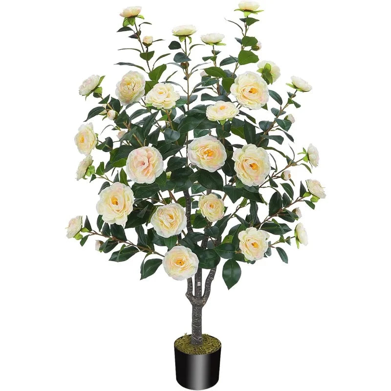 Artificial Camellia Fake Tree, Artificial Plants & Flowers with 32 Yellow Pink Flowers