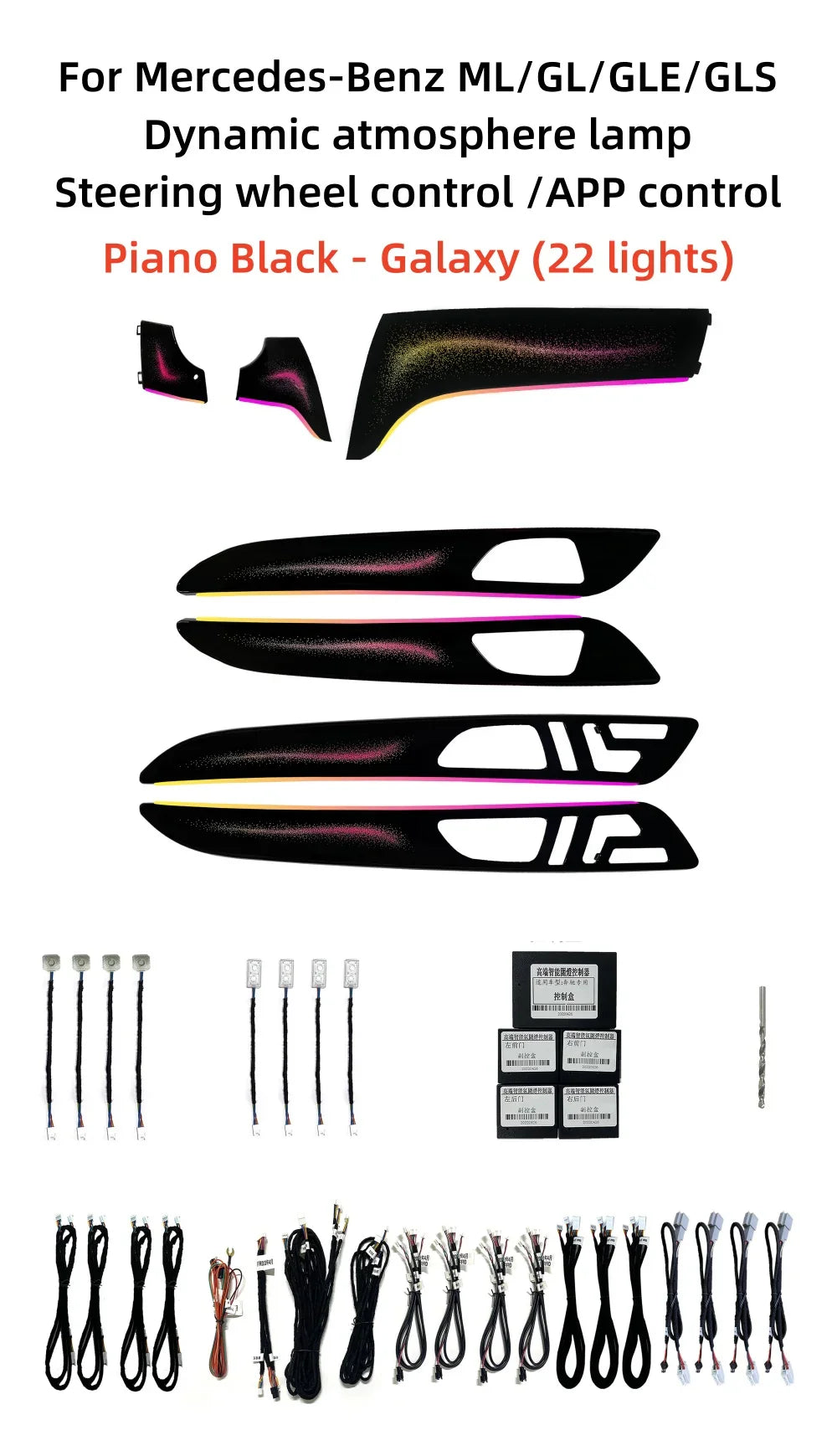 Included in the package: center console trim, four door trim, storage box light, foot socket light, control box, wiring harness.