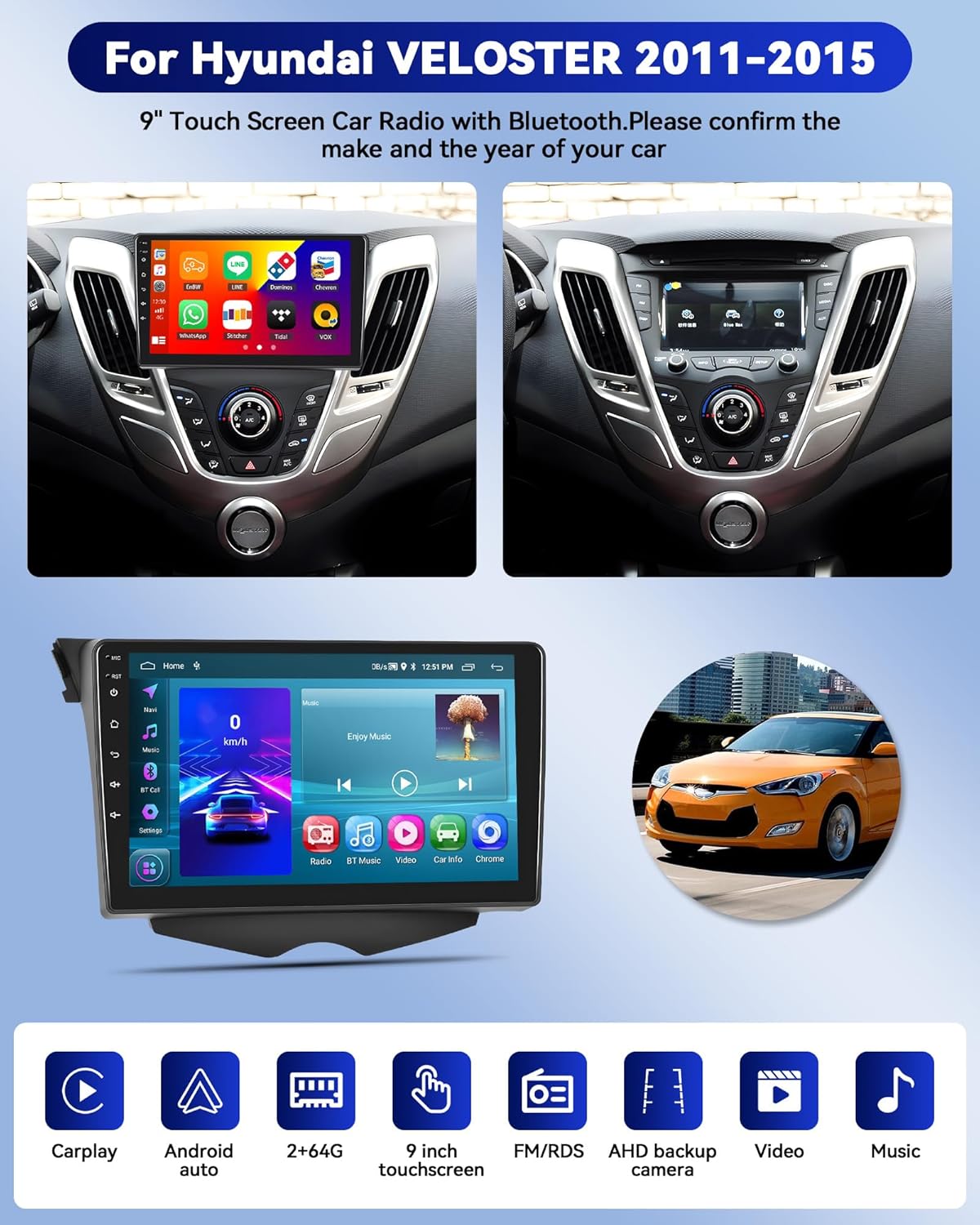 2+64G 9'' Touchscreen Car Radio for Hyundai Veloster 2011-2015 Head Unit with Carplay Android Auto