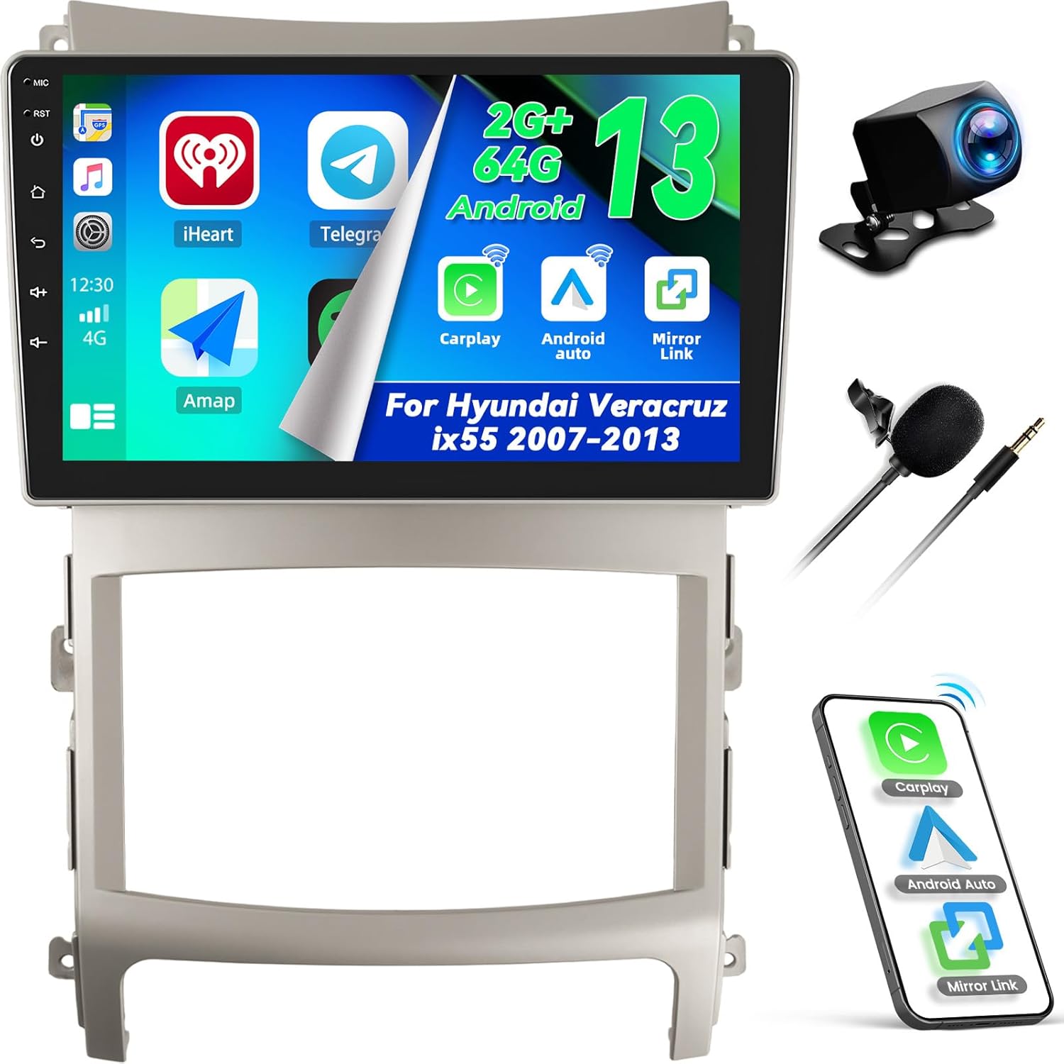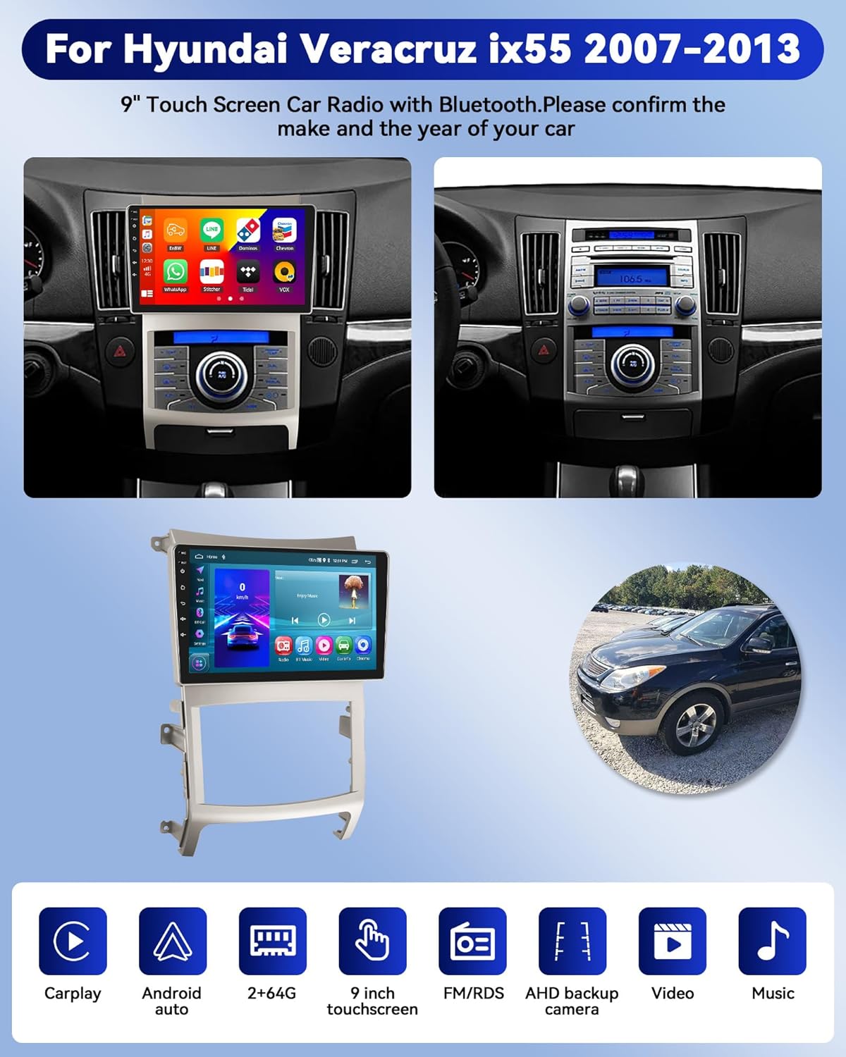 CAMECHO 9'' Touchscreen Car Radio for Hyundai Veracruz ix55 2007-2013 Head Unit with Carplay Android Auto, 2+64G Android 13 with Bluetooth 5.0, GPS Navigation, WiFi, FM/RDS + Backup Camera & Mic