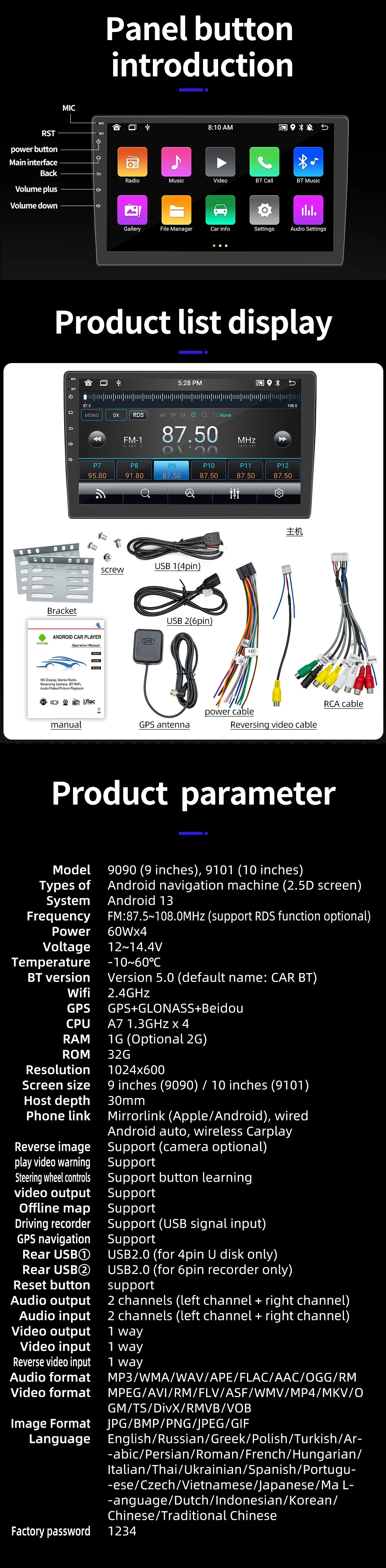 Others:Support Steering wheel control, Line output and subwoofer output