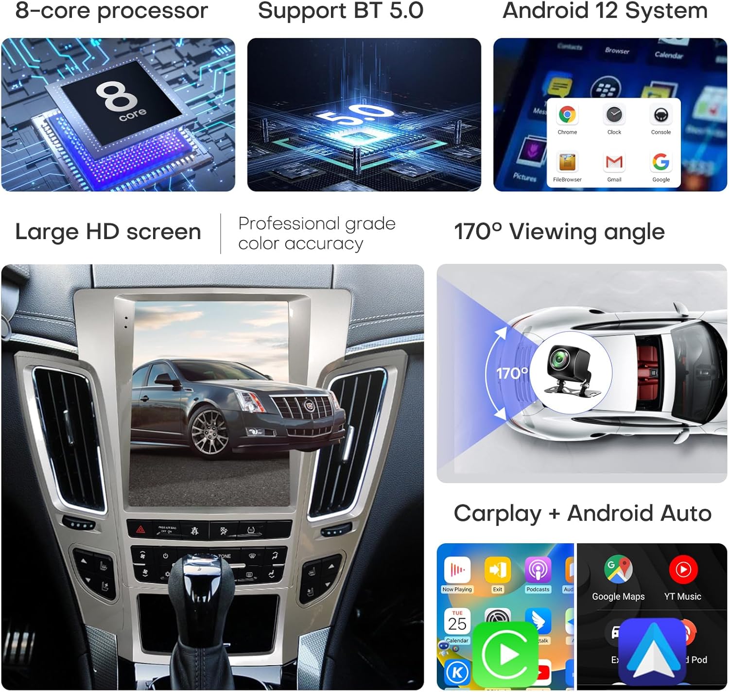 Car Radio for Cadillac CTS 2008-2012 Stereo Replacement Upgrade Carplay Android Auto Vertical Touch Screen Tesla Style with DSP in Dash Headunit Multimedia Player Audio Voice Control GPS Navigation