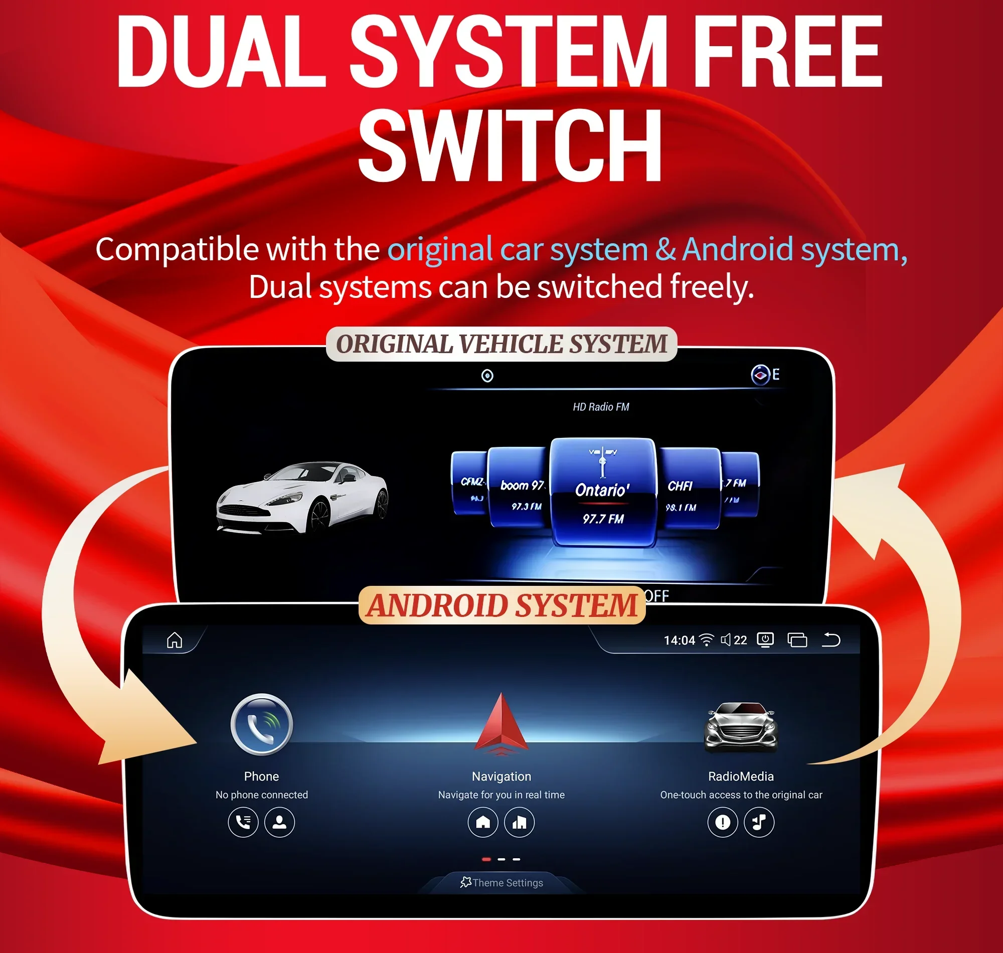 - Dual System, OEM and Android, Switch freely and support original functions, Such as car information display, Parking system, Original rear view camera ,radio, GPS navigation, Bluetooth, USB, etc.