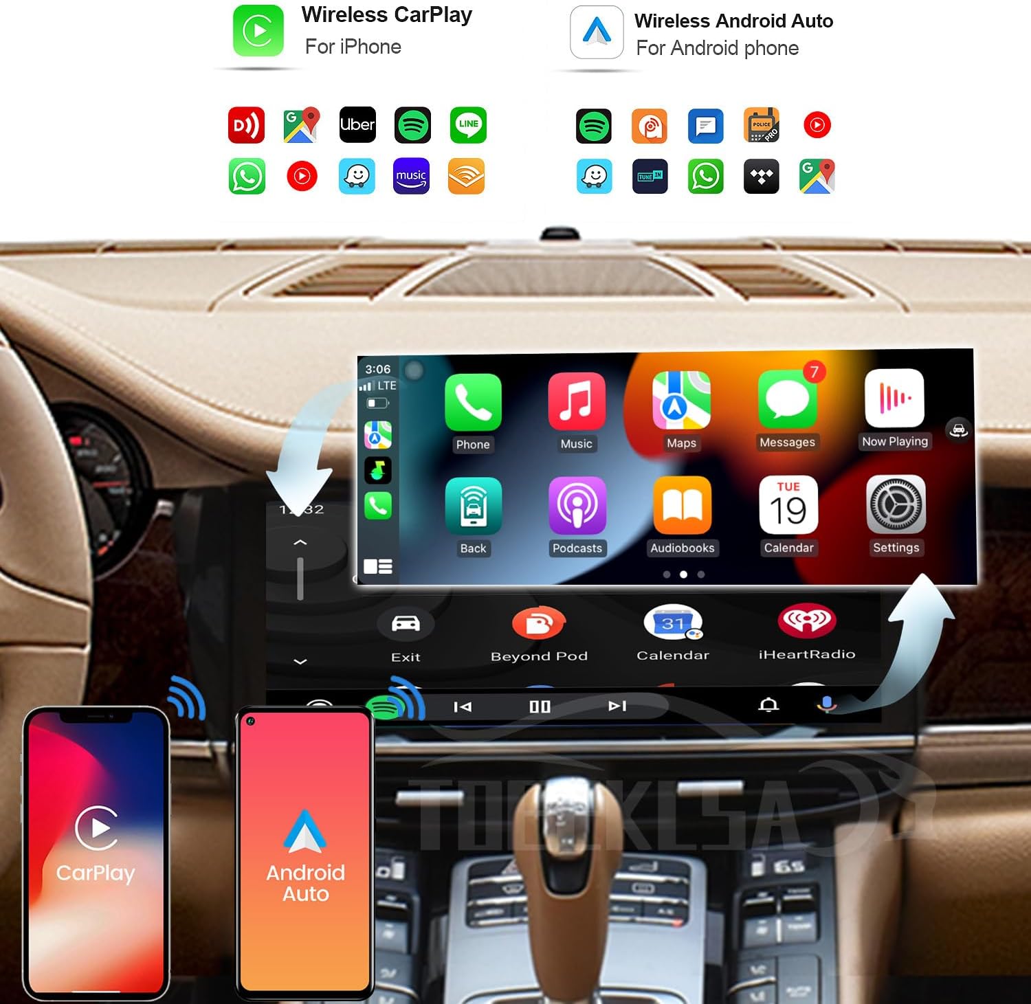 Apple Carplay: Wireless & Wired Connection Connect to Apple mobile phone, access mobile phone address book, mail, notification, map navigation, music, video and other information, and realize voice control. Android Auto: Wired Connection Android auto car system can closely integrate the user's Android phone and player, and realize navigation, make calls, send and receive information, listen to music and other operations through data cable connection;
