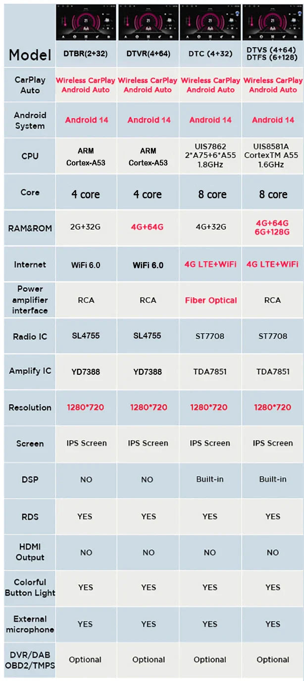 New DTBR, DTVR Versions: Equipped with a 4-core configuration, no DSP, and 4G SIM function. Despite differences in CPU and software solutions, it focuses on enhancing common functions such as WIFI, Bluetooth, and boot speed, bringing you a convenient experience.