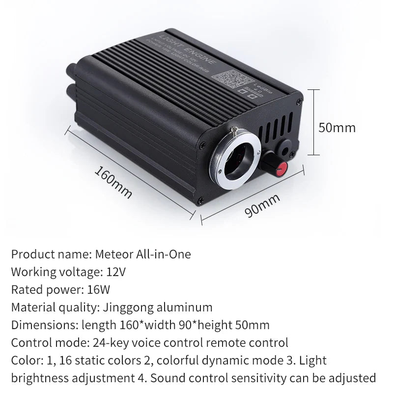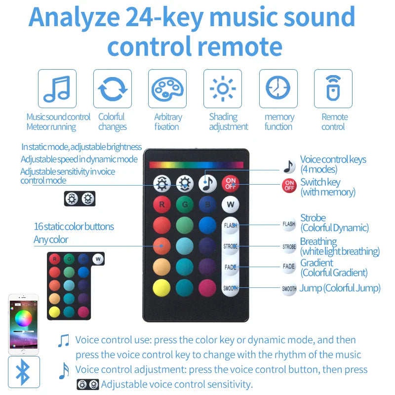 Static 15 colors (red, green, blue, yellow, mixed white, pure white, cyan, purple, etc.)And rgb light changes, color gradual changes, jumps, strobe and adjust brightness, mode speed and sound sensitivity adjustments.
